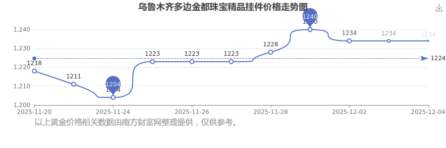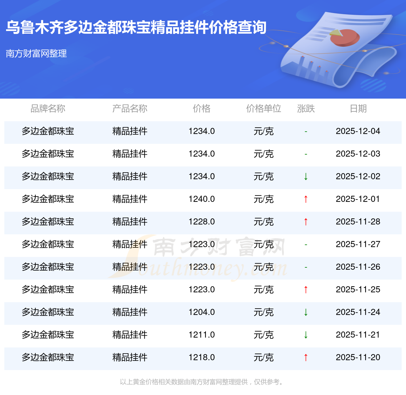 烏魯木齊多邊金都珠寶的精品掛件在今日(2025年12月4日),每克售價為1234.0元/克。