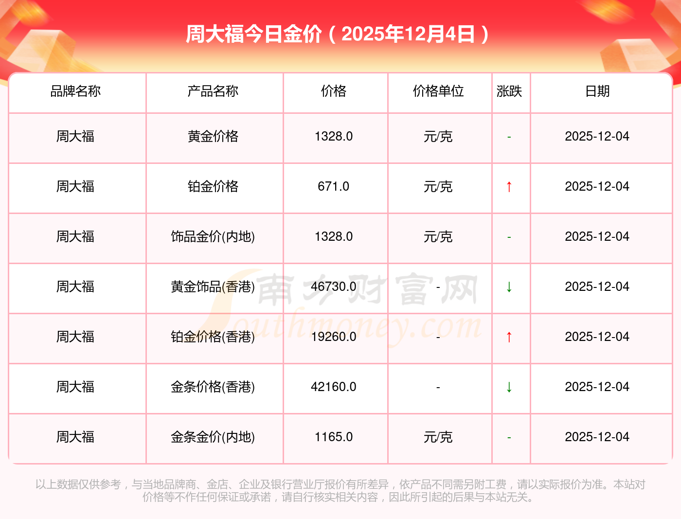 黃金價格1328.0元/克,鉑金價格671.0元/克,飾品金價(內(nèi)地)1328.0元/克,黃金飾品(香港)46730.0,鉑金價格(香港)19260.0,金條價格(香港)42160.0,金條金價(內(nèi)地)1165.0元/克,黃金價格1325.0元/克,鉑金價格600.0元/克,足金價格1325.0元/克,黃金價格1326.0元/克。
