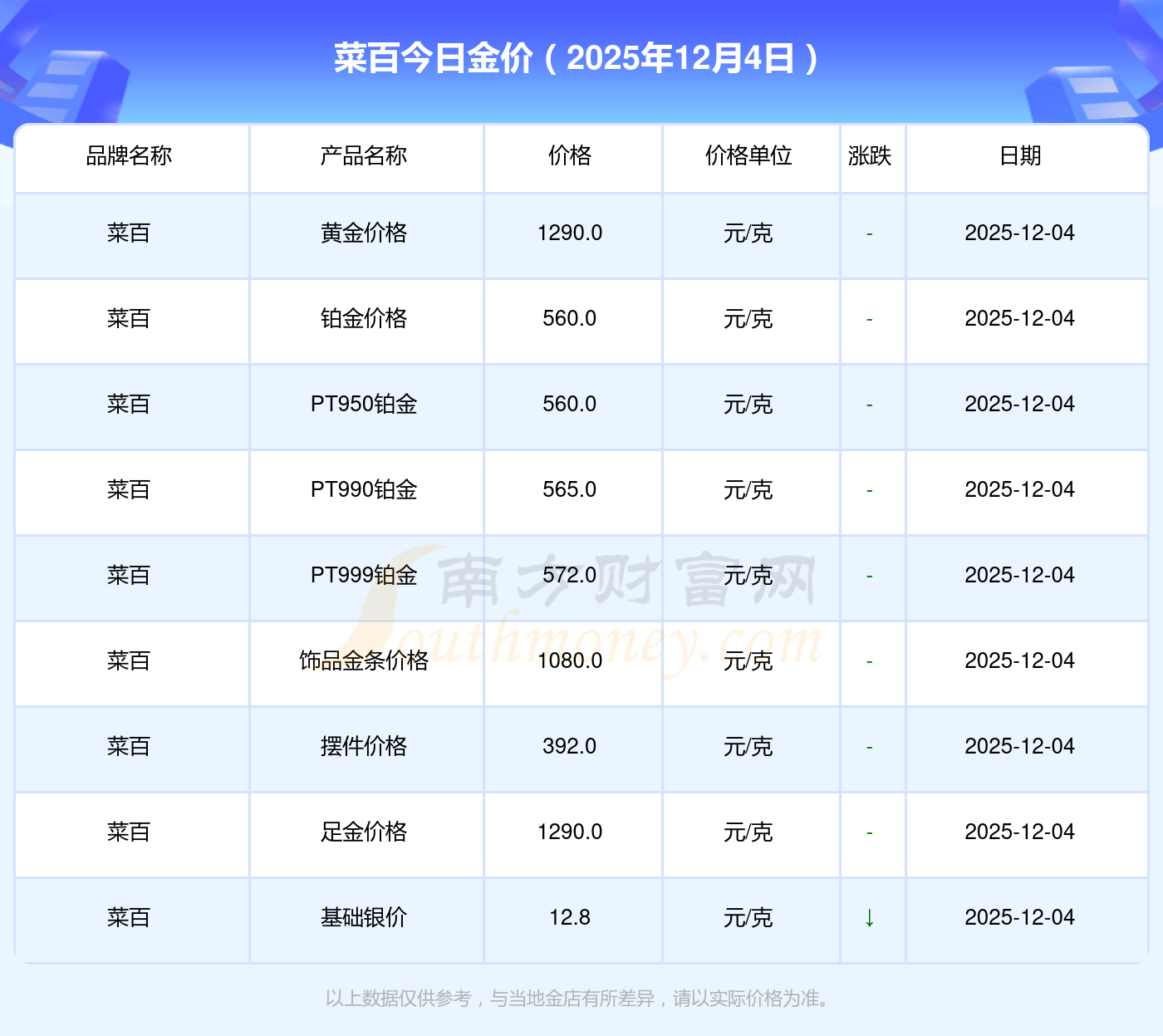 菜百今日金價(jià)的具體數(shù)字是怎樣的?數(shù)據(jù)來了:黃金價(jià)格1328.0元/克,鉑金價(jià)格671.0元/克,飾品金價(jià)(內(nèi)地)1328.0元/克,黃金飾品(香港)46730.0,鉑金價(jià)格(香港)19260.0,金條價(jià)格(香港)42160.0,金條金價(jià)(內(nèi)地)1165.0元/克,黃金價(jià)格1325.0元/克,鉑金價(jià)格600.0元/克,足金價(jià)格1325.0元/克,黃金價(jià)格1326.0元/克。