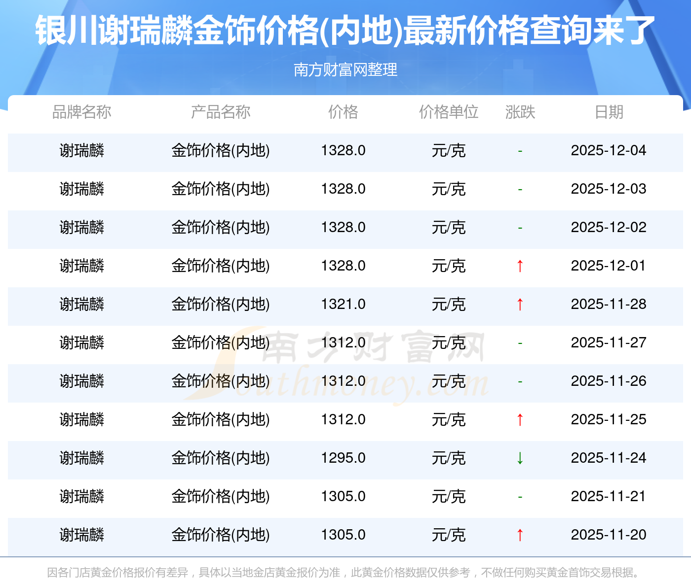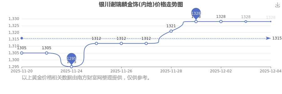 1328.0元/克,這是銀川謝瑞麟于 2025年12月4日所定的金飾(內(nèi)地)價格。