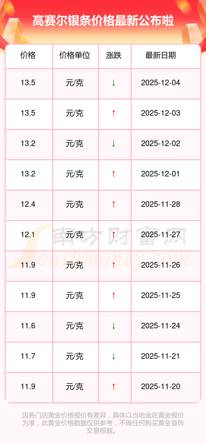 高賽爾 銀條于今日的最新掛牌價為13.5元/克。