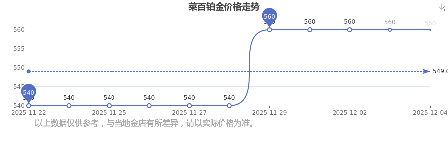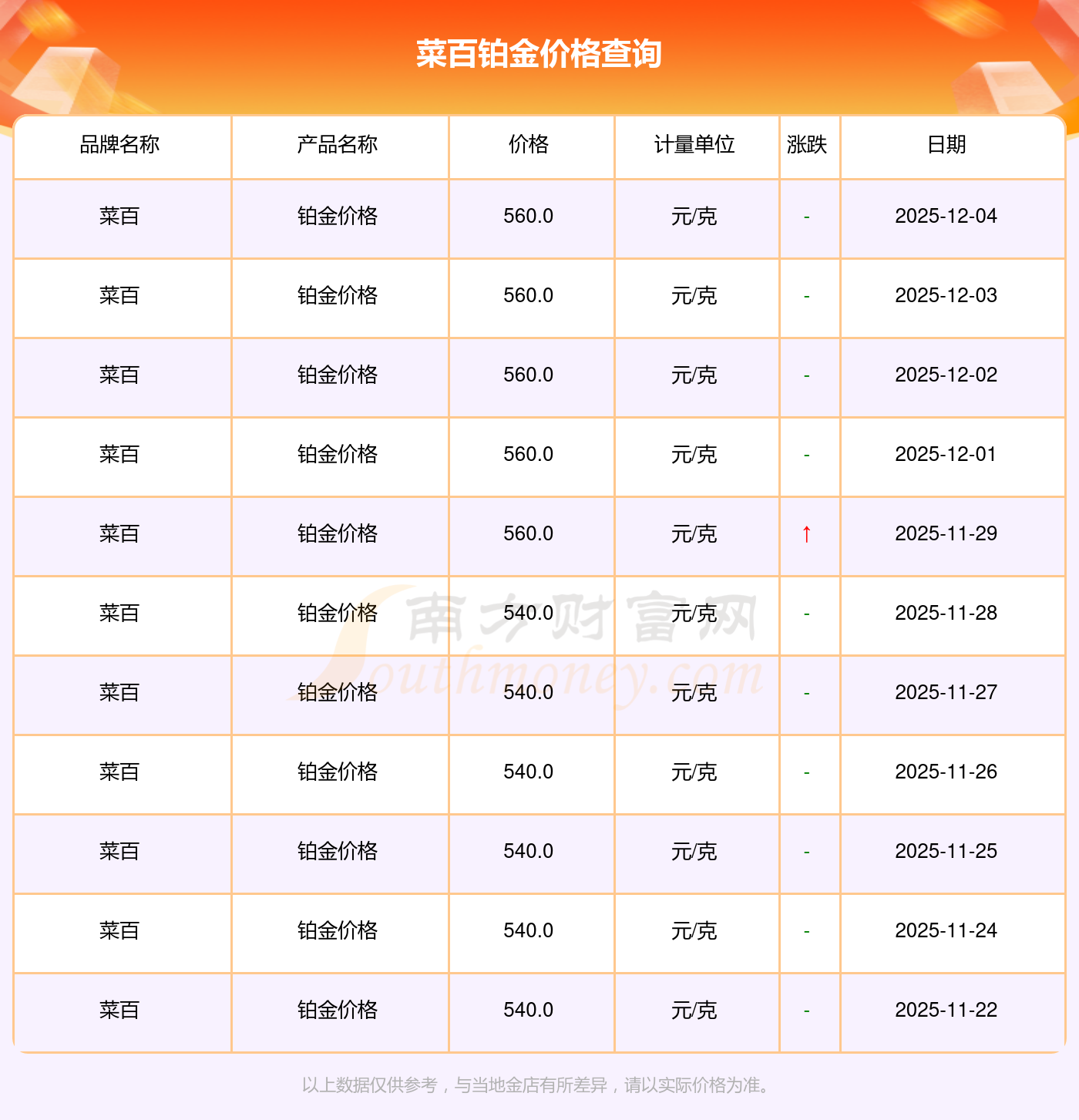 2025年12月4日菜百鉑金價格最新是560.0元/克。