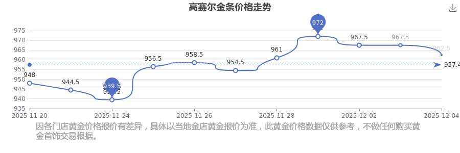 高賽爾今日金條的最新市場(chǎng)行情價(jià)為962.5元/克。