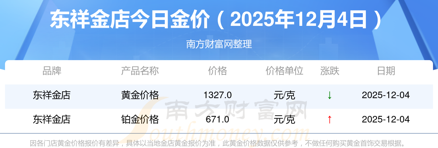 2025年12月4日周大福、周大福、周大福、周大福、周大福、周大福、周大福、老鳳祥、老鳳祥、老鳳祥、六福等各大金店品牌黃金價(jià)格最新價(jià)格如下:周大福黃金價(jià)格1328.0元/克,周大福鉑金價(jià)格671.0元/克,周大福飾品金價(jià)(內(nèi)地)1328.0元/克,周大福黃金飾品(香港)46730.0,周大福鉑金價(jià)格(香港)19260.0,周大福金條價(jià)格(香港)42160.0,周大福金條金價(jià)(內(nèi)地)1165.0元/克,老鳳祥黃金價(jià)格1325.0元/克,老鳳祥鉑金價(jià)格600.0元/克,老鳳祥足金價(jià)格1325.0元/克,六福黃金價(jià)格1326.0元/克。