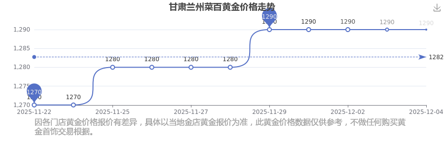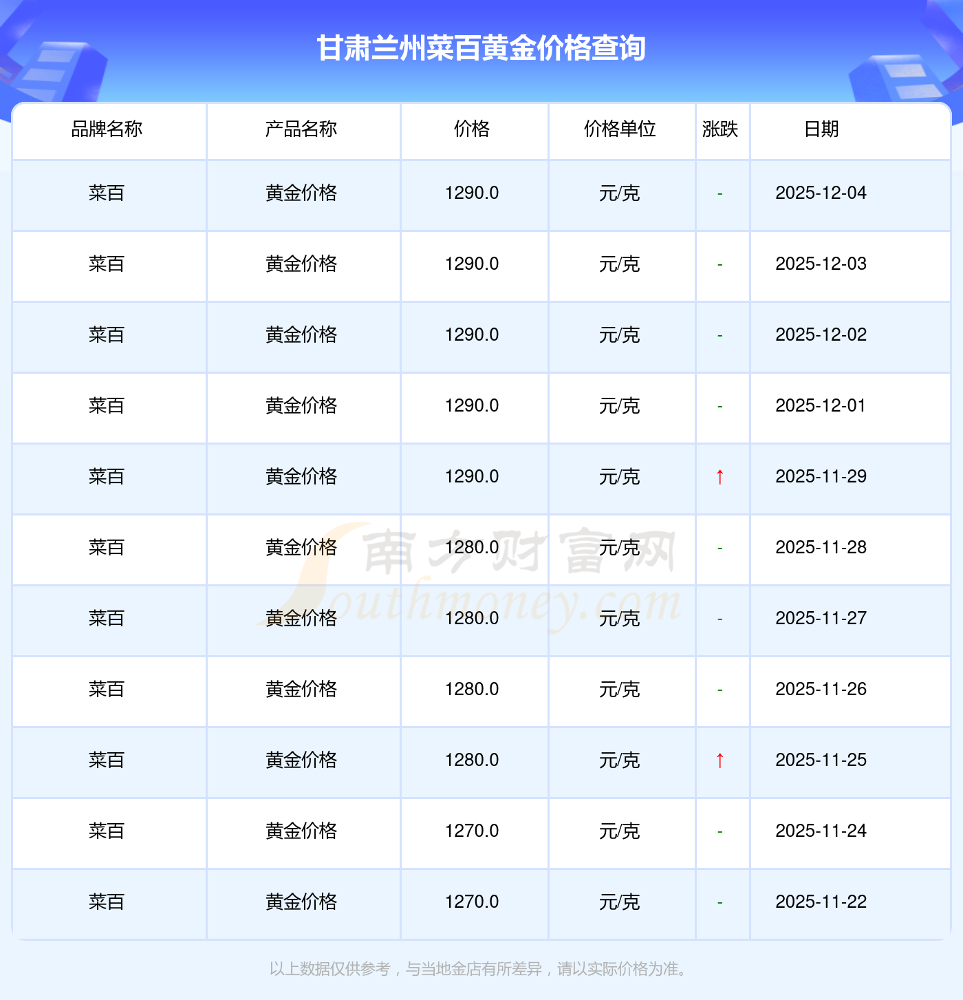 今日(2025年12月4日),甘肅蘭州菜百黃金價格的定價為 1290.0元/克。