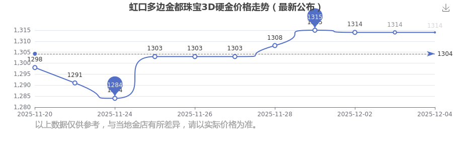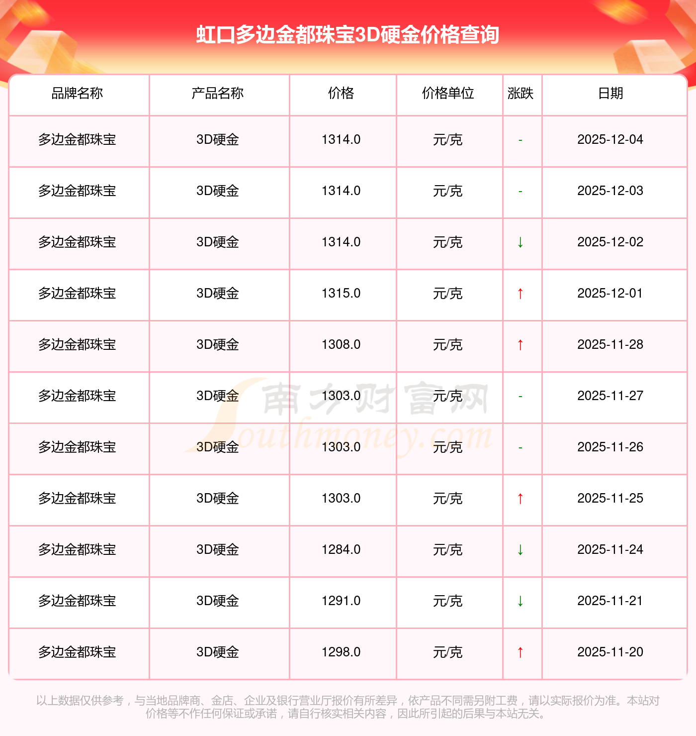 今日(2025年12月4日),虹口多邊金都珠寶3D硬金每克的價值為1314.0元/克。