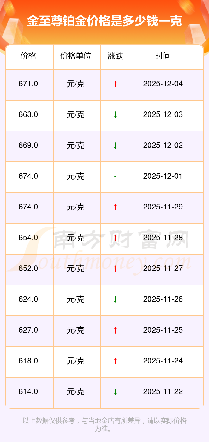 今日(2025年12月4日)金至尊鉑金價格:671.0元/克。