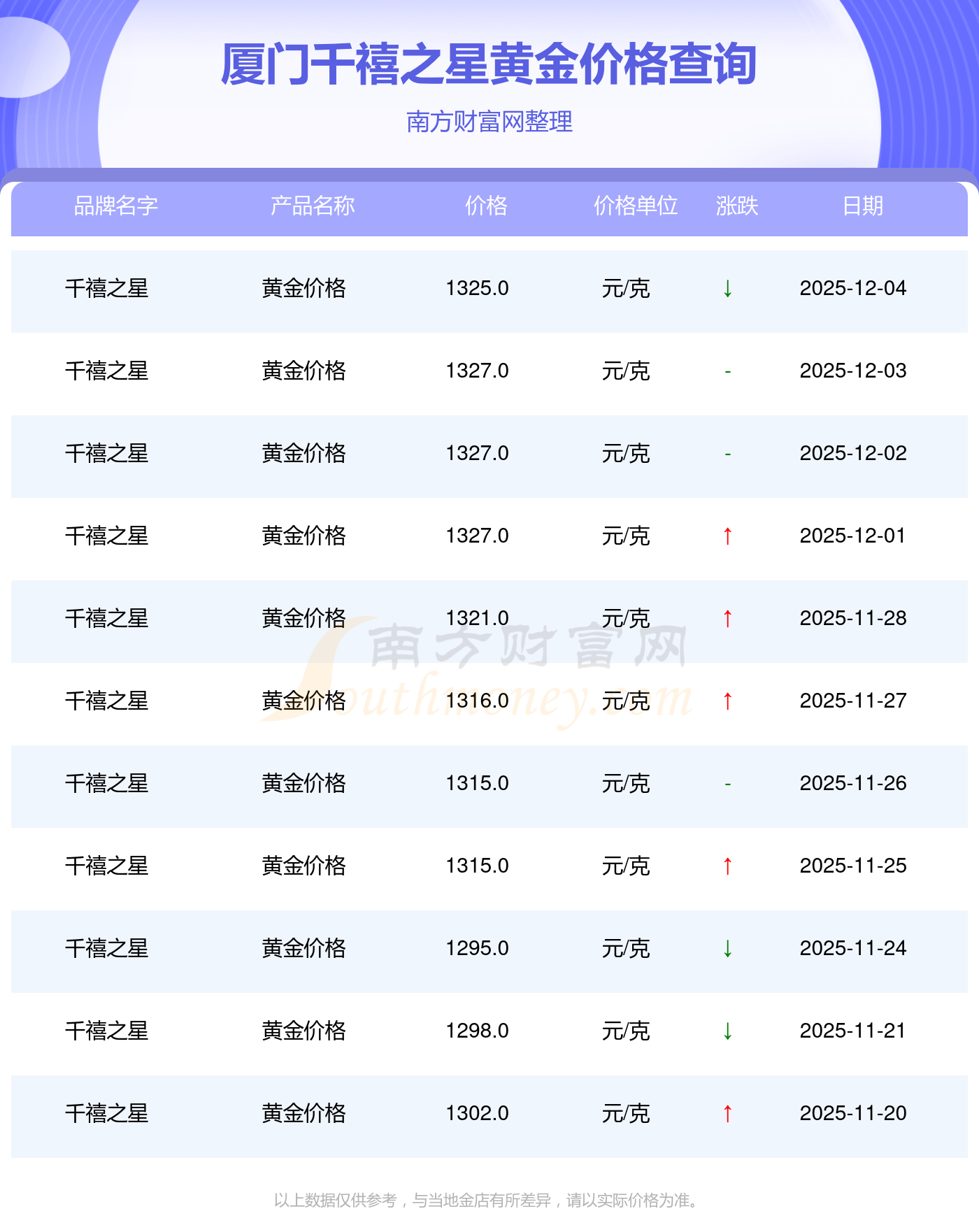 今日(2025年12月4日),廈門千禧之星黃金價格每克的價值為1325.0元/克。