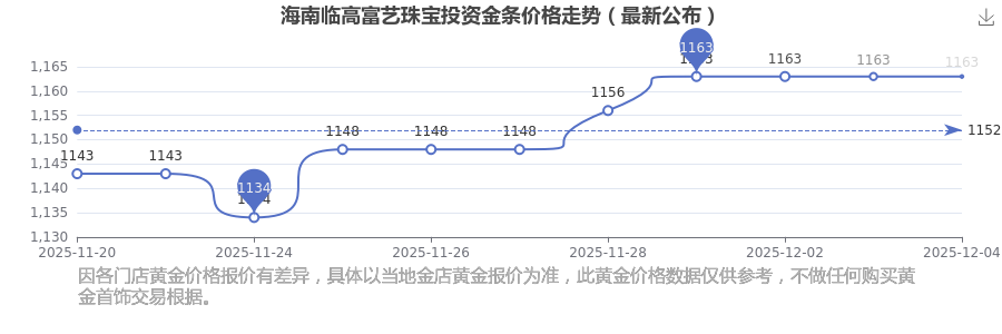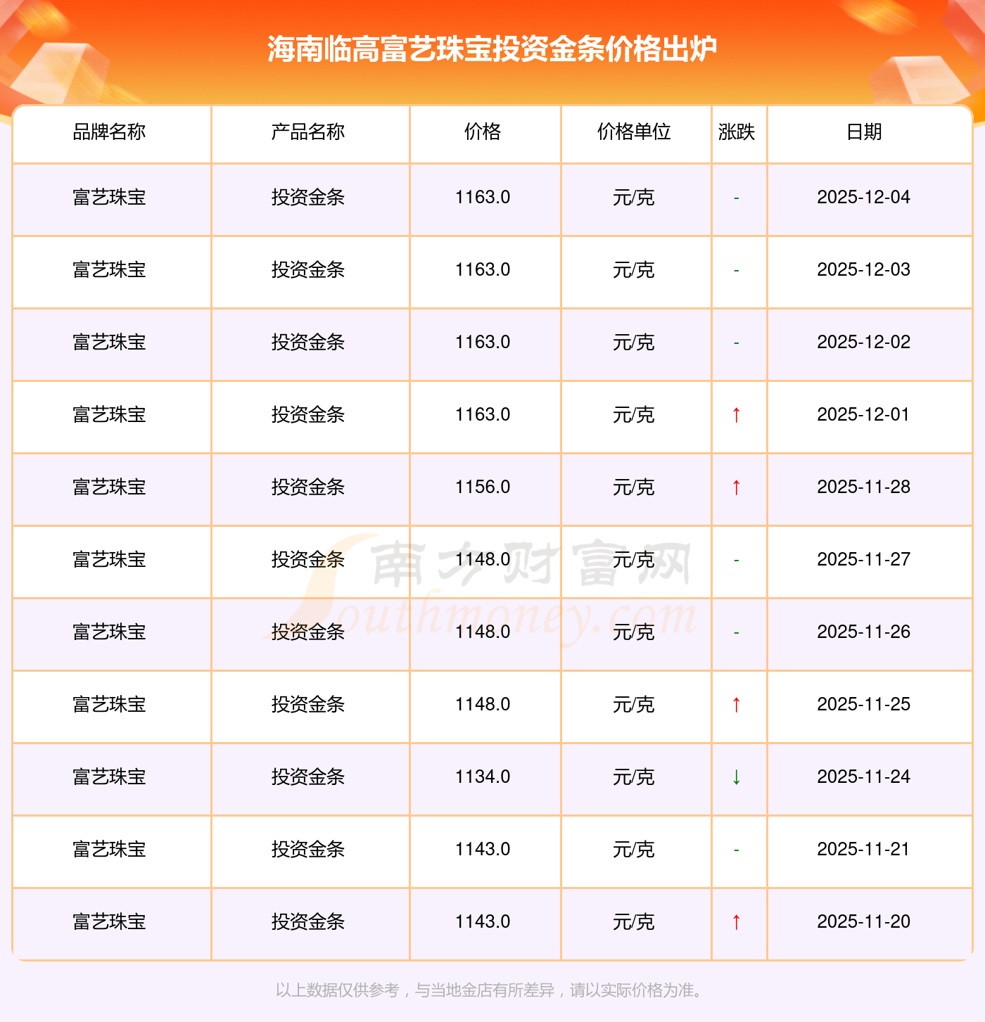 2025年12月4日,海南臨高富藝珠寶投資金條每克的價值量定格在1163.0元/克。