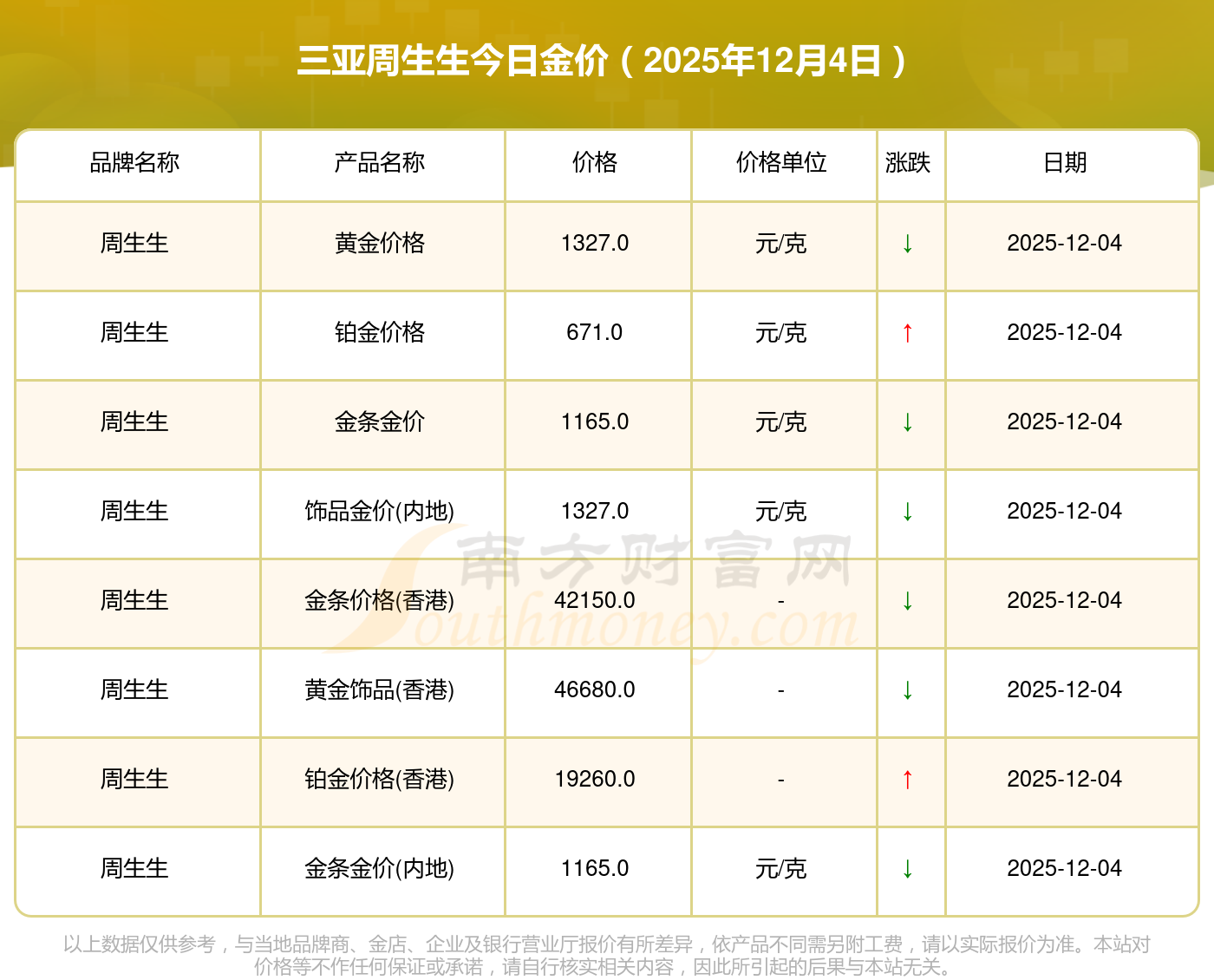2025年12月4日三亞周生生一克黃金對(duì)應(yīng)的價(jià)格是多少?黃金價(jià)格1328.0元/克,鉑金價(jià)格671.0元/克,飾品金價(jià)(內(nèi)地)1328.0元/克,黃金飾品(香港)46730.0,鉑金價(jià)格(香港)19260.0,金條價(jià)格(香港)42160.0,金條金價(jià)(內(nèi)地)1165.0元/克,黃金價(jià)格1325.0元/克,鉑金價(jià)格600.0元/克,足金價(jià)格1325.0元/克,黃金價(jià)格1326.0元/克。