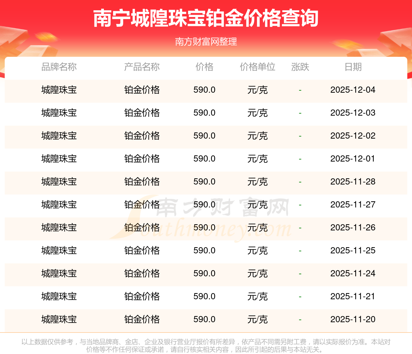 2025年12月4日當(dāng)天,南寧城隍珠寶鉑金價(jià)格的單價(jià)是 590.0元/克。