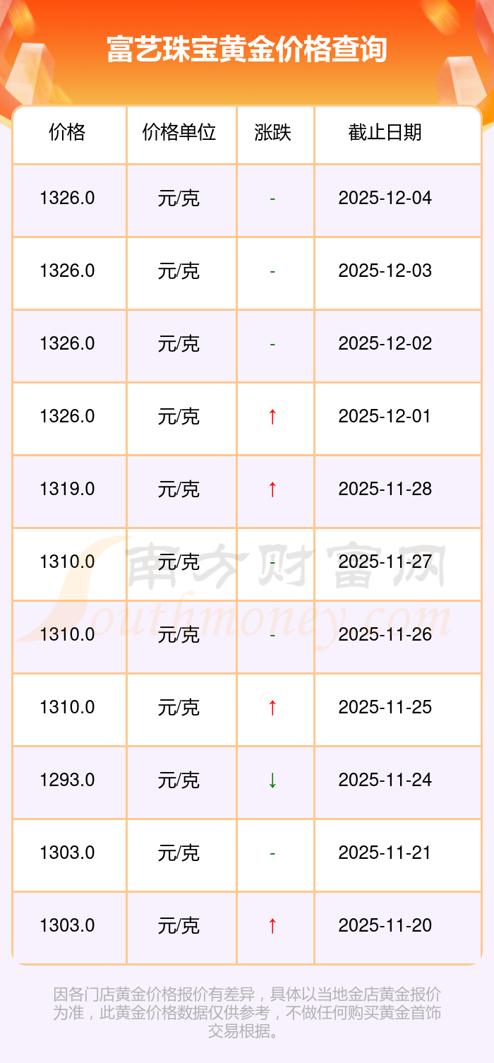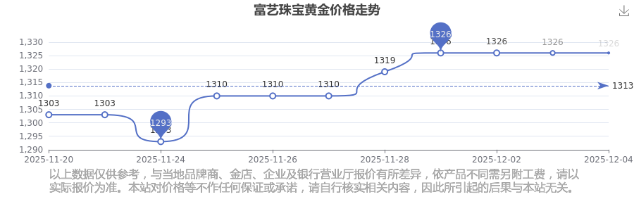 最新數(shù)據(jù)表明,富藝珠寶今日 黃金價(jià)格為1326.0元/克。