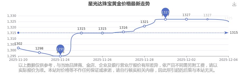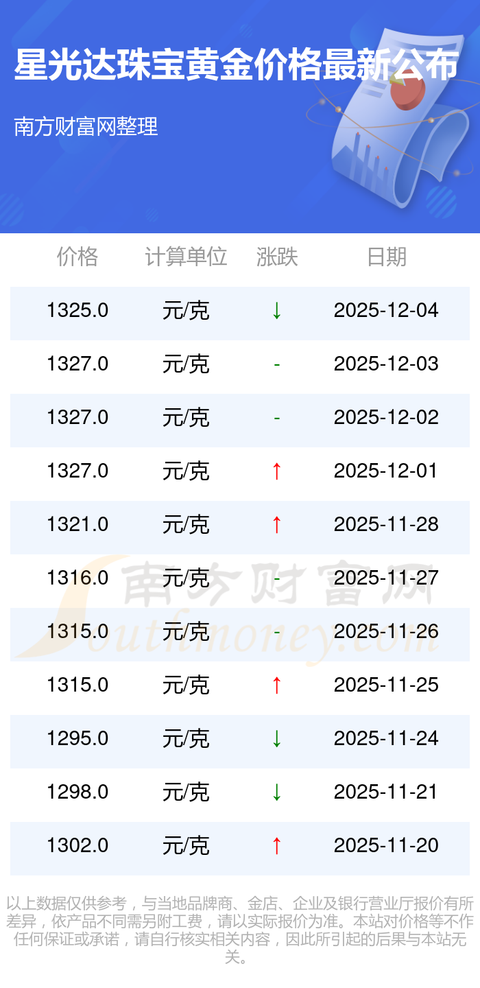 2025年12月4日星光達珠寶黃金價格是1325.0元/克。