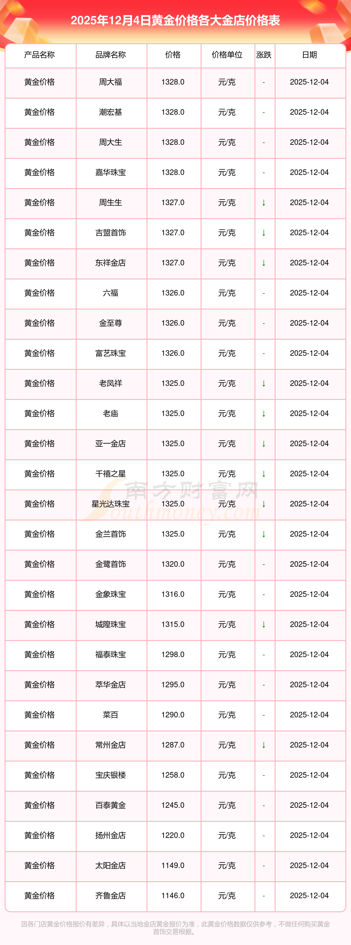 2025年12月4日各大金店黃金價格最新價格:周大福1328.0元/克,周大福671.0元/克,周大福1328.0元/克,周大福46730.0,周大福19260.0,周大福42160.0,周大福1165.0元/克,老鳳祥1325.0元/克,老鳳祥600.0元/克,老鳳祥1325.0元/克,六福1326.0元/克。