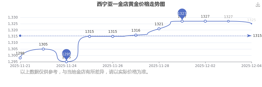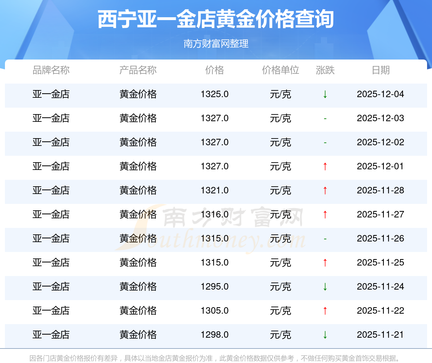 2025年12月4日西寧亞一金店黃金價格為1325.0元/克。