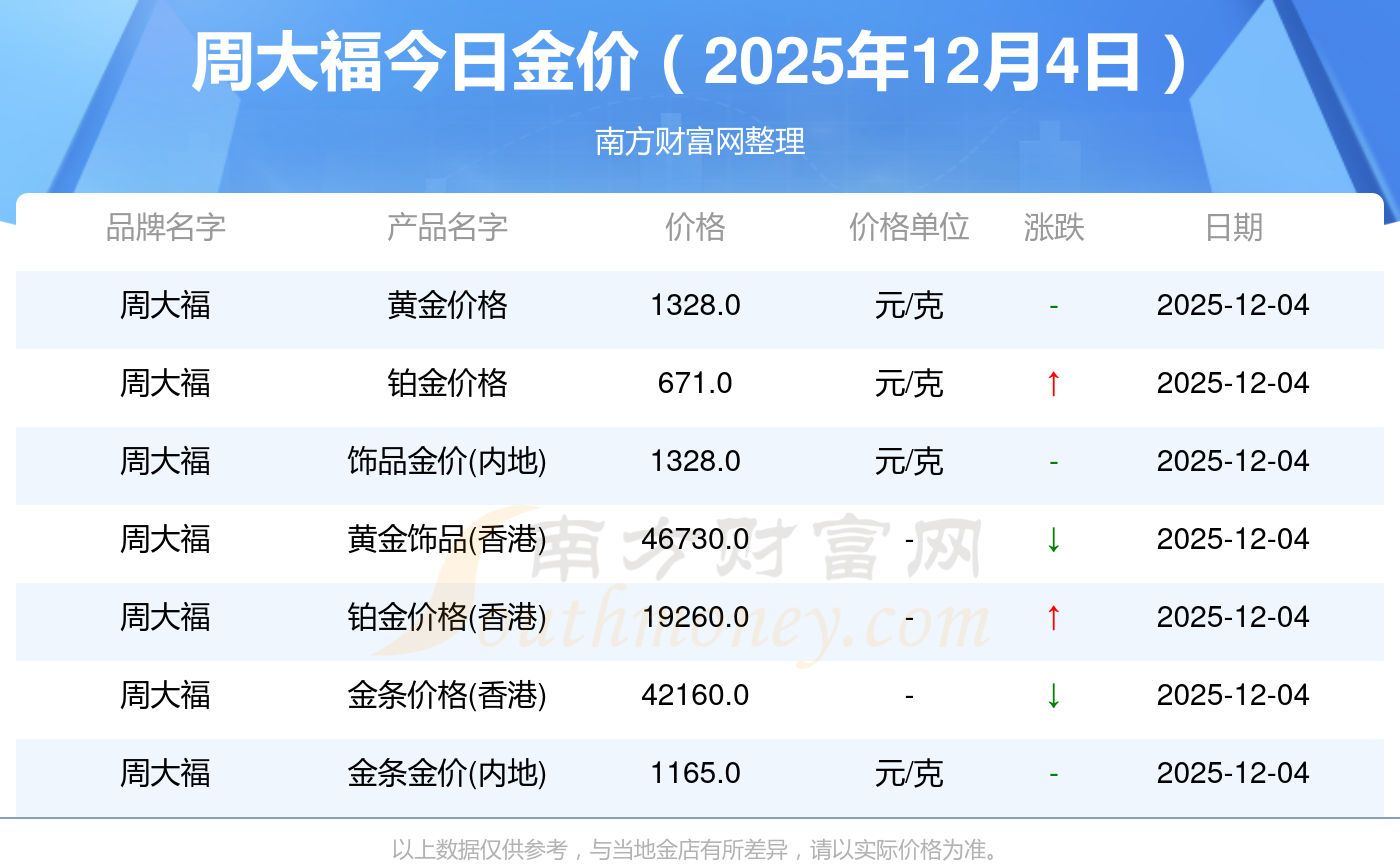 2025年12月4日周大福、周大福、周大福、周大福、周大福、周大福、周大福、老鳳祥、老鳳祥、老鳳祥、六福等各大金店品牌黃金價(jià)格最新價(jià)格如下:周大福黃金價(jià)格1328.0元/克,周大福鉑金價(jià)格671.0元/克,周大福飾品金價(jià)(內(nèi)地)1328.0元/克,周大福黃金飾品(香港)46730.0,周大福鉑金價(jià)格(香港)19260.0,周大福金條價(jià)格(香港)42160.0,周大福金條金價(jià)(內(nèi)地)1165.0元/克,老鳳祥黃金價(jià)格1325.0元/克,老鳳祥鉑金價(jià)格600.0元/克,老鳳祥足金價(jià)格1325.0元/克,六福黃金價(jià)格1326.0元/克。