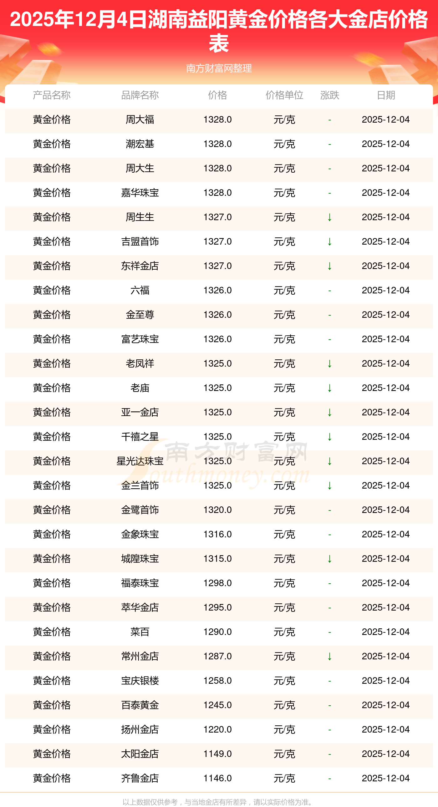 2025年12月4日,湖南益陽周大福、周大福、周大福、周大福、周大福、周大福、周大福、老鳳祥、老鳳祥、老鳳祥、六福等各大金店品牌黃金價(jià)格今日價(jià)格行情最新來了:周大福1328.0元/克、周大福671.0元/克、周大福1328.0元/克、周大福46730.0、周大福19260.0、周大福42160.0、周大福1165.0元/克、老鳳祥1325.0元/克、老鳳祥600.0元/克、老鳳祥1325.0元/克、六福1326.0元/克。