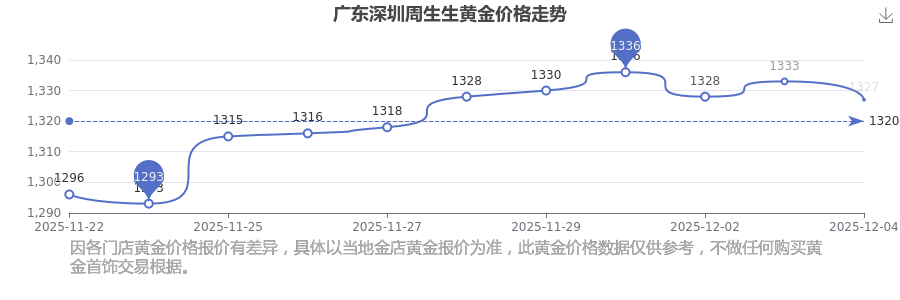 今日(2025年12月4日)廣東深圳周生生黃金價格最新價格為1327.0元/克。