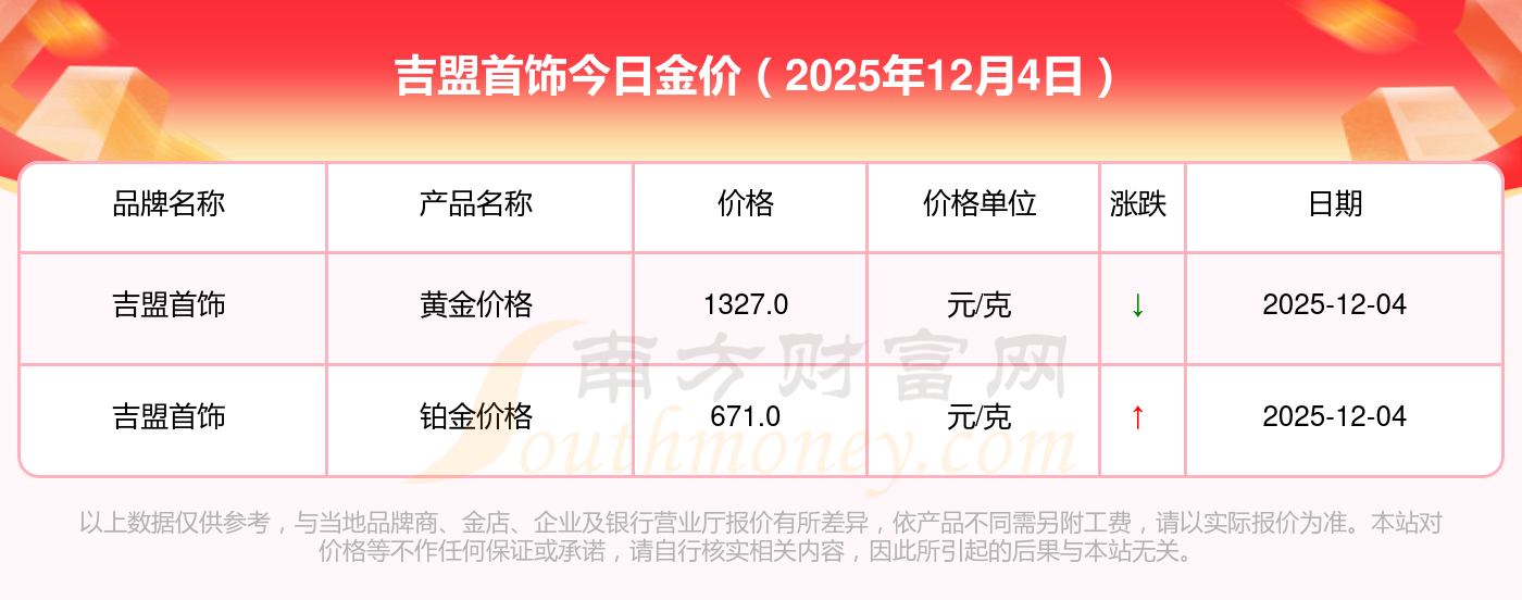 現(xiàn)在吉盟首飾黃金價(jià)格是多少錢1克_2025年吉盟首飾今日金價(jià)是多少錢一克,最新吉盟首飾查詢,2025年12月4日吉盟首飾黃金價(jià)格現(xiàn)在每克多少錢?最新吉盟首飾黃金價(jià)格報(bào)價(jià)公布,一起來看看吧!