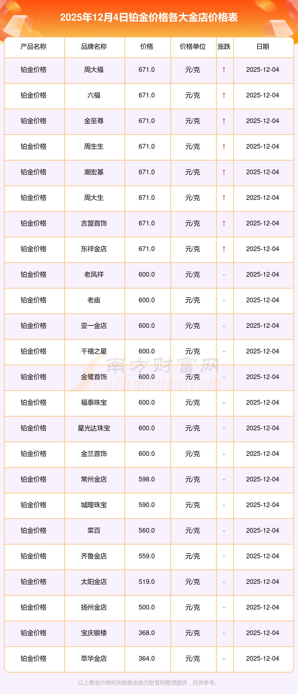 2025年12月4日周大福、周大福、周大福、周大福、周大福、周大福、周大福、老鳳祥、老鳳祥、老鳳祥、六福等各大金店品牌鉑金價格最新價格如下:周大福黃金價格1328.0元/克,周大福鉑金價格671.0元/克,周大福飾品金價(內地)1328.0元/克,周大福黃金飾品(香港)46730.0,周大福鉑金價格(香港)19260.0,周大福金條價格(香港)42160.0,周大福金條金價(內地)1165.0元/克,老鳳祥黃金價格1325.0元/克,老鳳祥鉑金價格600.0元/克,老鳳祥足金價格1325.0元/克,六福黃金價格1326.0元/克。