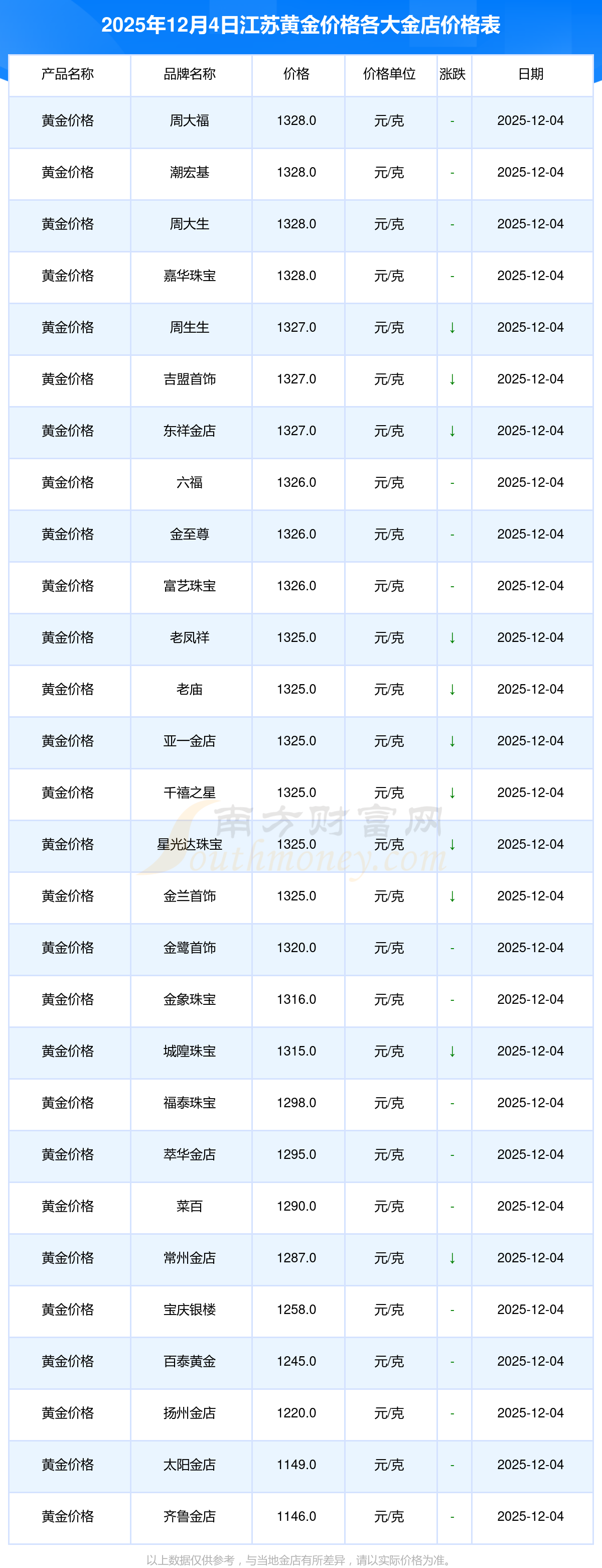 今天是2025年12月4日,江蘇周大福、周大福、周大福、周大福、周大福、周大福、周大福、老鳳祥、老鳳祥、老鳳祥、六福等各大金店品牌黃金價格最新價格如下:周大福1328.0元/克、周大福671.0元/克、周大福1328.0元/克、周大福46730.0、周大福19260.0、周大福42160.0、周大福1165.0元/克、老鳳祥1325.0元/克、老鳳祥600.0元/克、老鳳祥1325.0元/克、六福1326.0元/克。