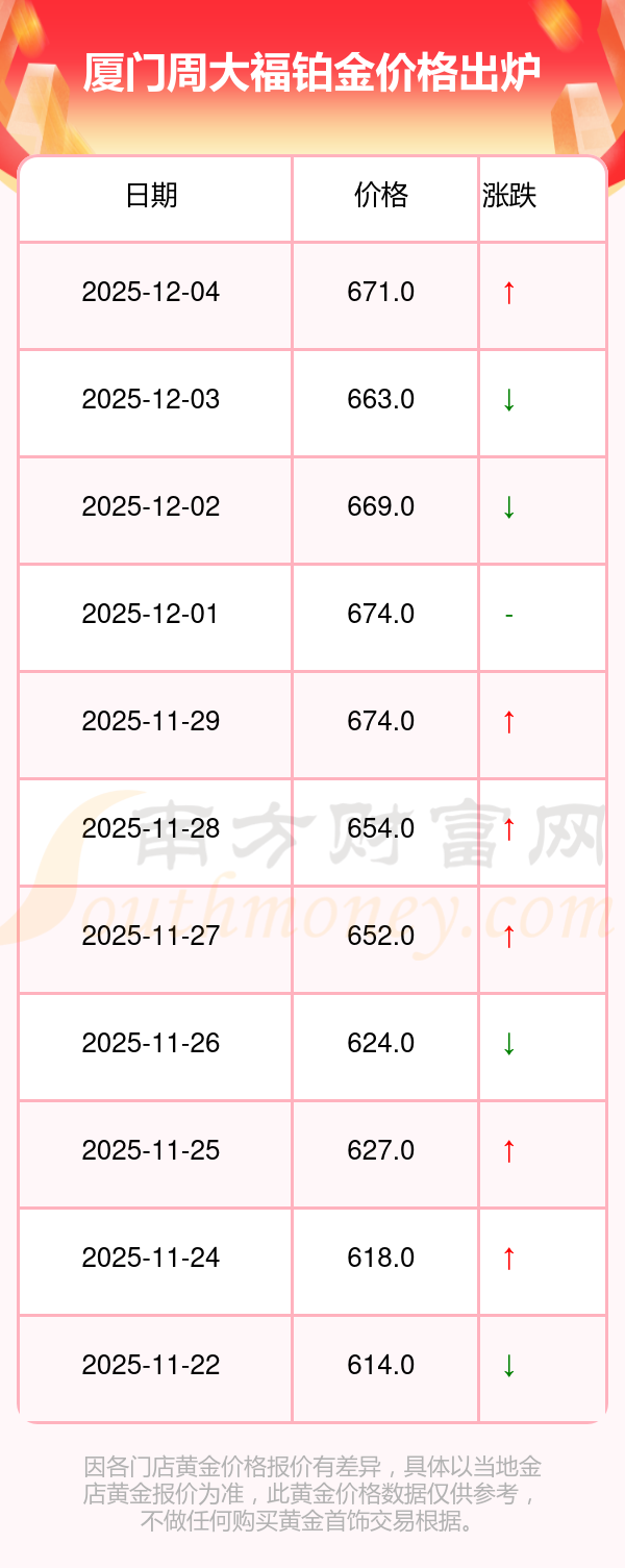 2025年12月4日,廈門(mén)周大福鉑金價(jià)格每克的價(jià)值量定格在671.0元/克。