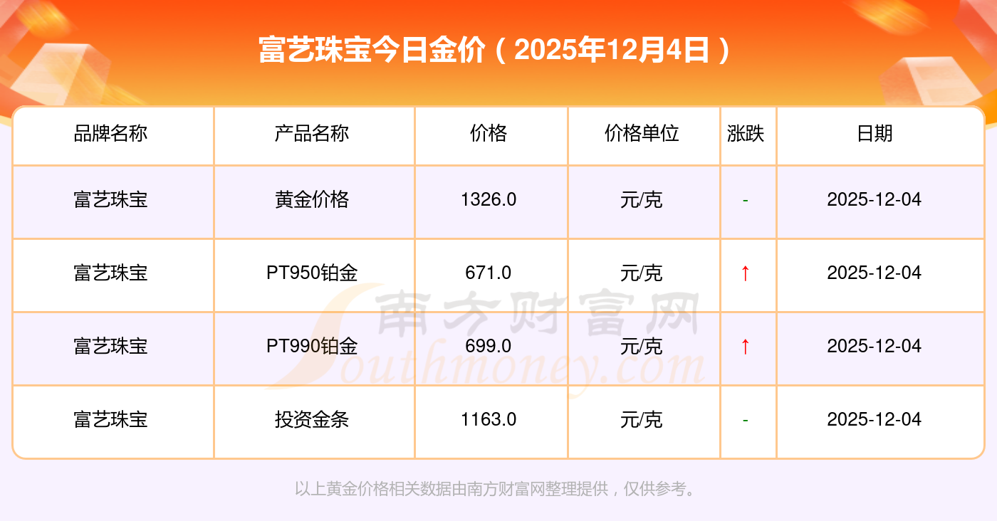 2025年12月4日富藝珠寶最新價格:黃金價格1328.0元/克,鉑金價格671.0元/克,飾品金價(內(nèi)地)1328.0元/克,黃金飾品(香港)46730.0,鉑金價格(香港)19260.0,金條價格(香港)42160.0,金條金價(內(nèi)地)1165.0元/克,黃金價格1325.0元/克,鉑金價格600.0元/克,足金價格1325.0元/克,黃金價格1326.0元/克。