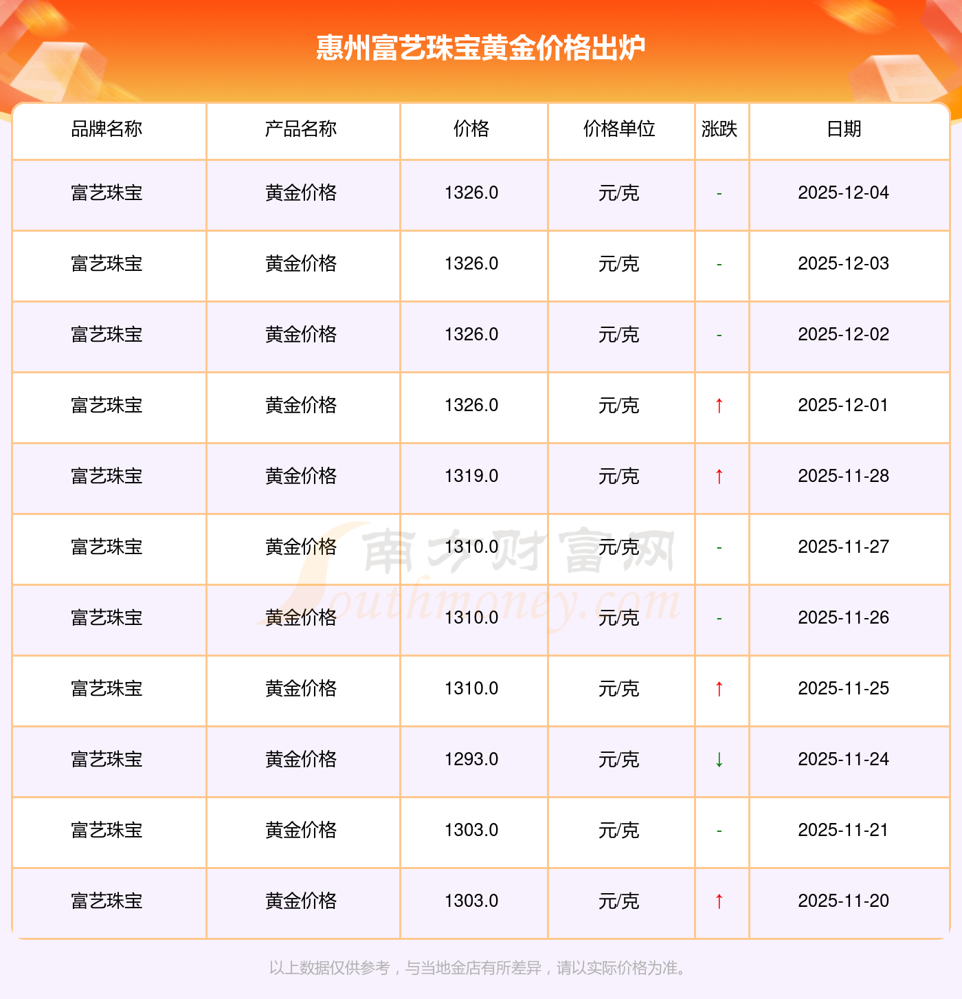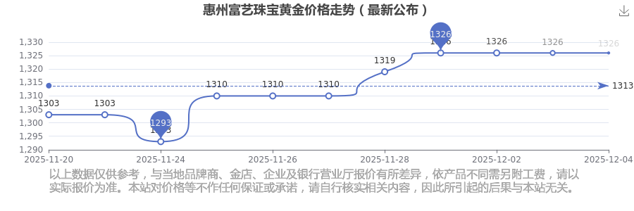 今日(2025年12月4日),惠州富藝珠寶黃金價格每克的價值為1326.0元/克。
