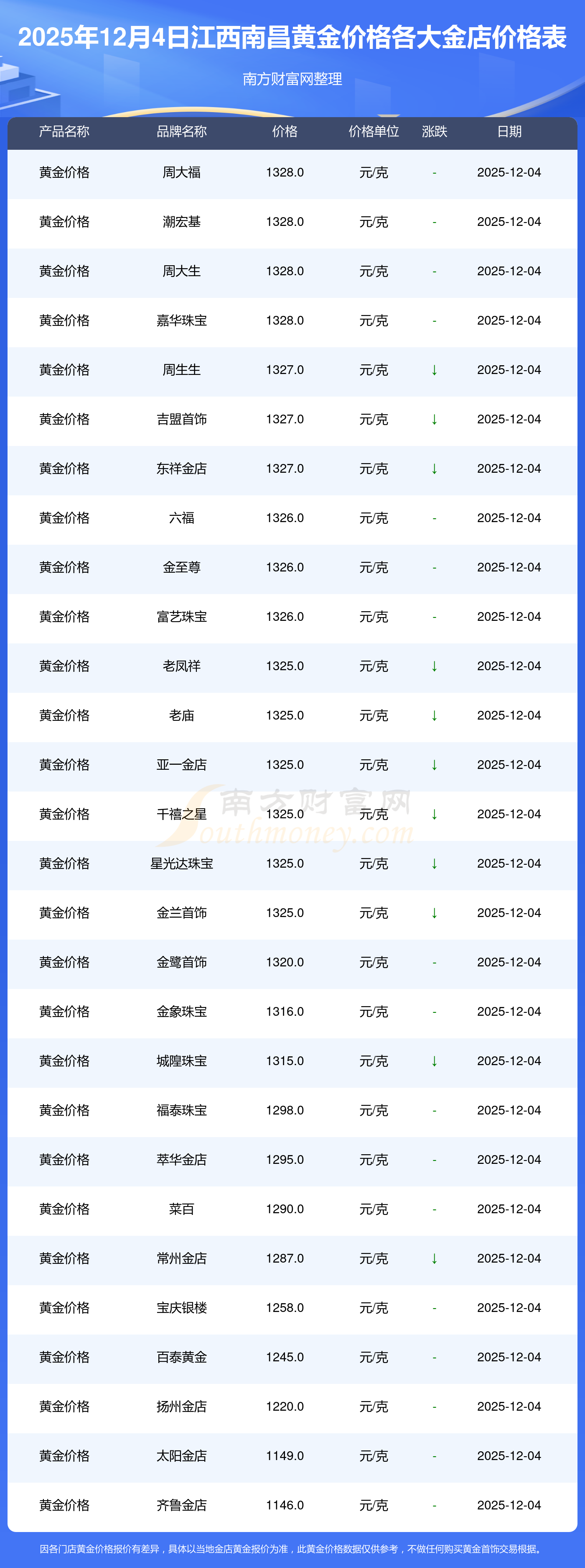 2025年12月4日,江西南昌周大福、周大福、周大福、周大福、周大福、周大福、周大福、老鳳祥、老鳳祥、老鳳祥、六福等各大金店品牌黃金價(jià)格今日價(jià)格行情最新來(lái)了:周大福1328.0元/克、周大福671.0元/克、周大福1328.0元/克、周大福46730.0、周大福19260.0、周大福42160.0、周大福1165.0元/克、老鳳祥1325.0元/克、老鳳祥600.0元/克、老鳳祥1325.0元/克、六福1326.0元/克。