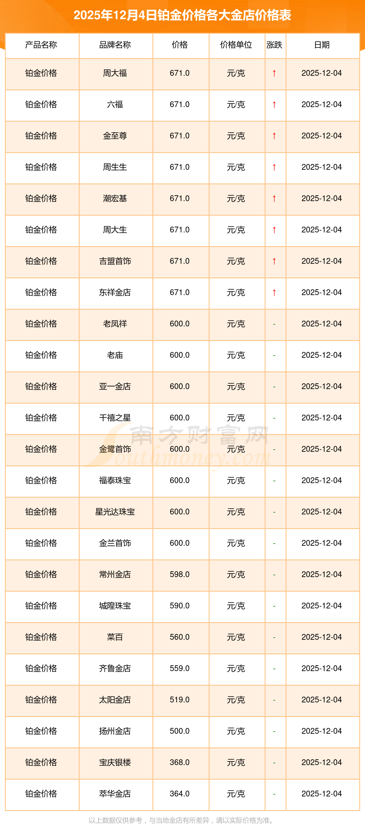 2025年12月4日各大金店鉑金價(jià)格最新價(jià)格:周大福1328.0元/克,周大福671.0元/克,周大福1328.0元/克,周大福46730.0,周大福19260.0,周大福42160.0,周大福1165.0元/克,老鳳祥1325.0元/克,老鳳祥600.0元/克,老鳳祥1325.0元/克,六福1326.0元/克。
