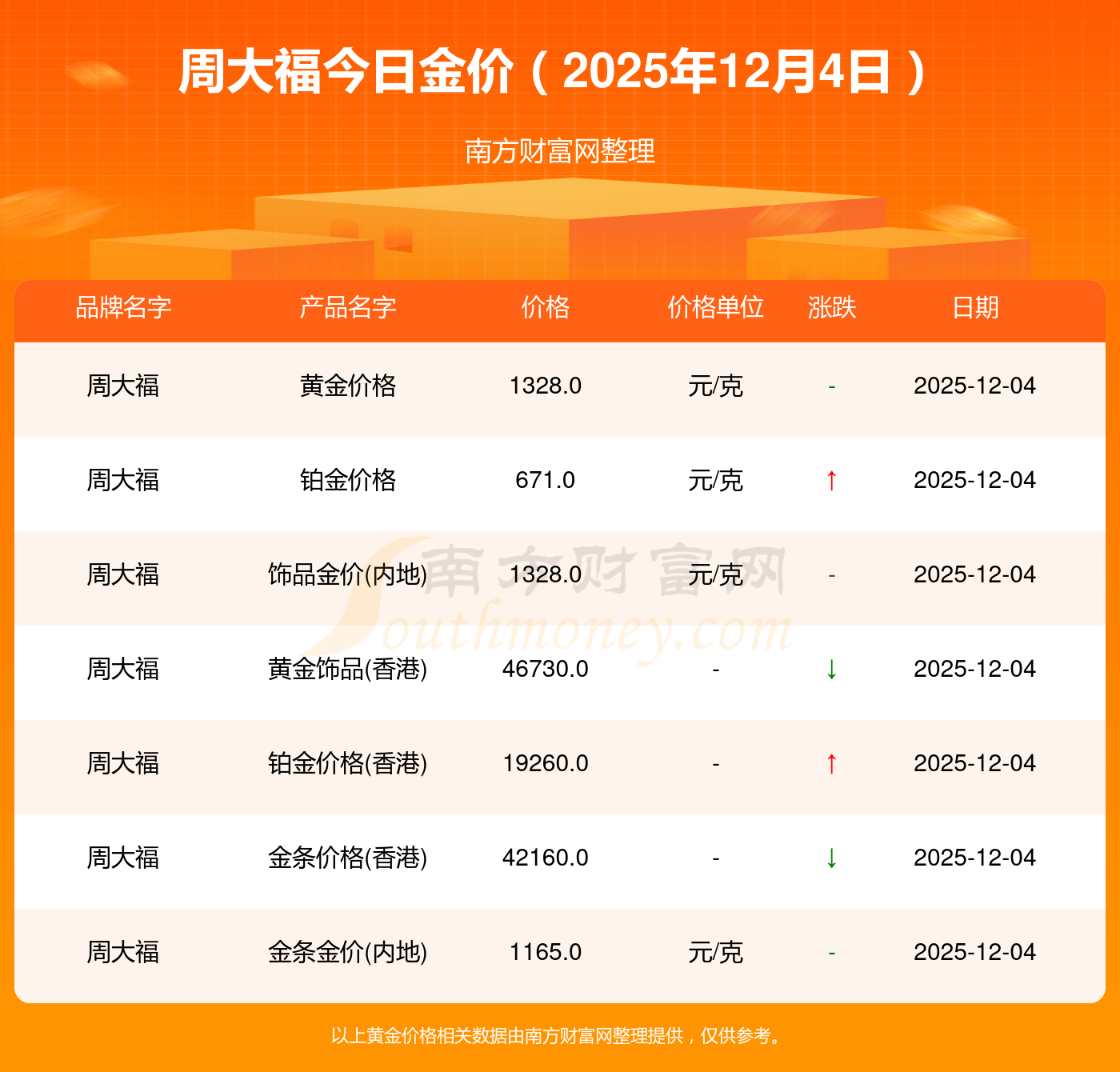 周大福今日黃金價格行情如何:黃金價格1328.0元/克,鉑金價格671.0元/克,飾品金價(內(nèi)地)1328.0元/克,黃金飾品(香港)46730.0,鉑金價格(香港)19260.0,金條價格(香港)42160.0,金條金價(內(nèi)地)1165.0元/克,黃金價格1325.0元/克,鉑金價格600.0元/克,足金價格1325.0元/克,黃金價格1326.0元/克。