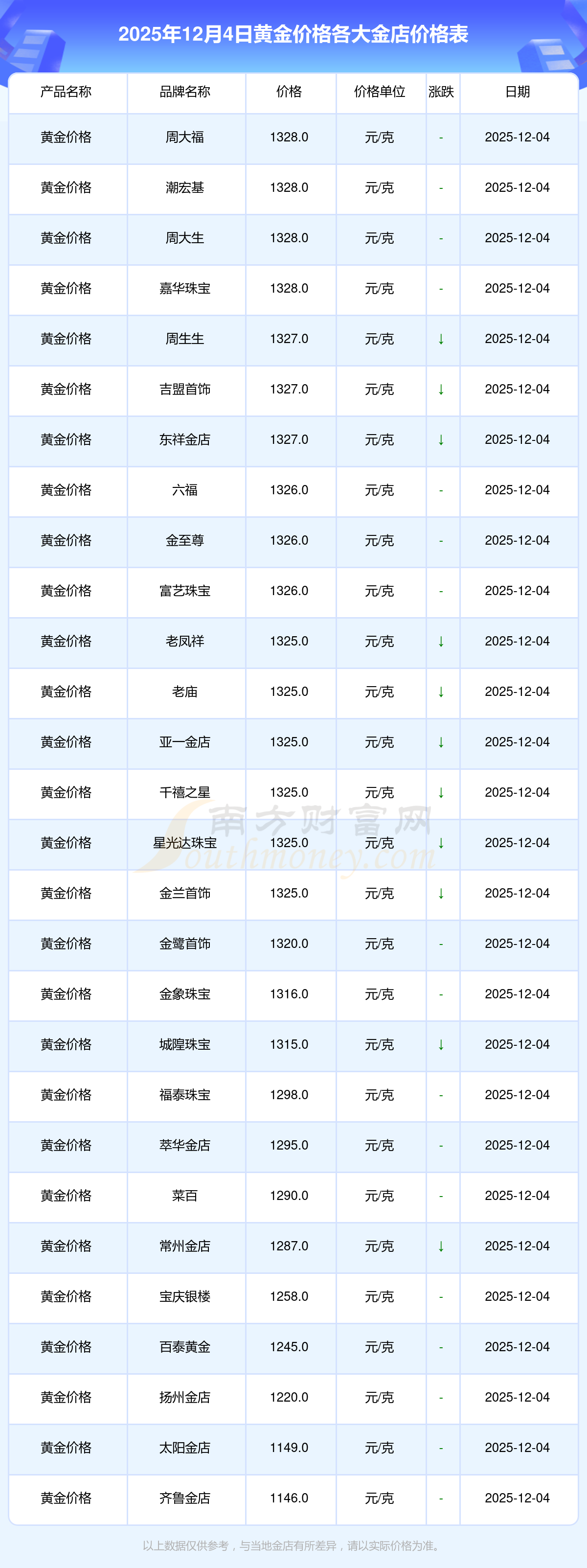 2025年12月4日各大金店黃金價(jià)格最新價(jià)格:周大福1328.0元/克,周大福671.0元/克,周大福1328.0元/克,周大福46730.0,周大福19260.0,周大福42160.0,周大福1165.0元/克,老鳳祥1325.0元/克,老鳳祥600.0元/克,老鳳祥1325.0元/克,六福1326.0元/克。