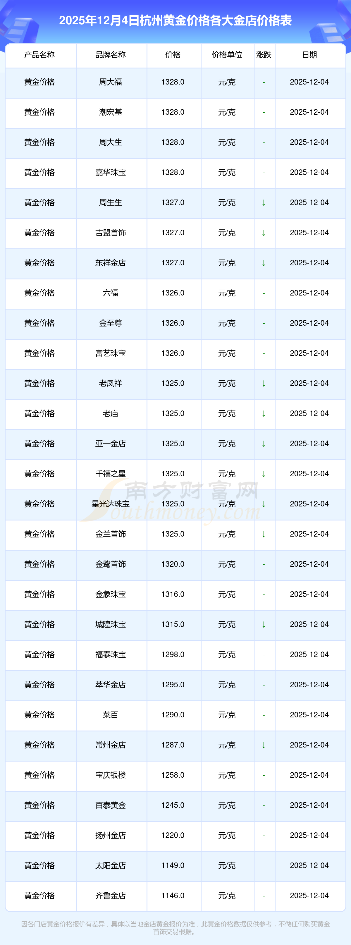 2025年12月4日杭州各大金店黃金價格最新價格:周大福1328.0元/克,周大福671.0元/克,周大福1328.0元/克,周大福46730.0,周大福19260.0,周大福42160.0,周大福1165.0元/克,老鳳祥1325.0元/克,老鳳祥600.0元/克,老鳳祥1325.0元/克,六福1326.0元/克。