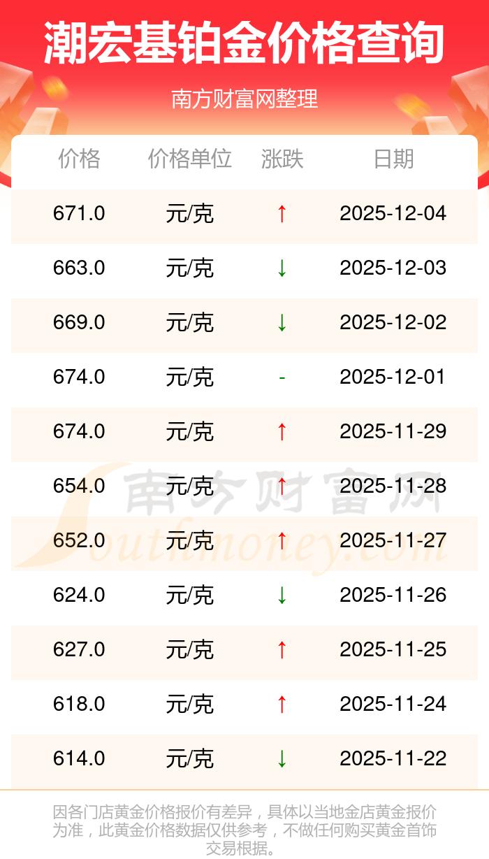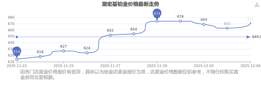 潮宏基今日 鉑金價(jià)格的最新市場(chǎng)行情價(jià)為671.0元/克。