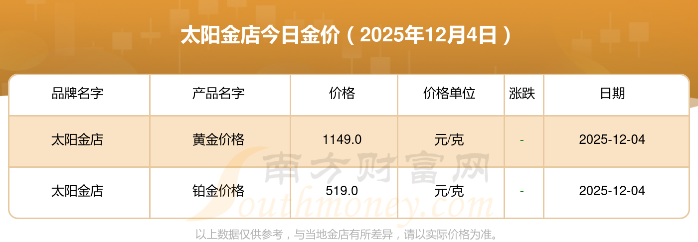 2025年12月4日太陽金店最新價格:黃金價格1328.0元/克,鉑金價格671.0元/克,飾品金價(內(nèi)地)1328.0元/克,黃金飾品(香港)46730.0,鉑金價格(香港)19260.0,金條價格(香港)42160.0,金條金價(內(nèi)地)1165.0元/克,黃金價格1325.0元/克,鉑金價格600.0元/克,足金價格1325.0元/克,黃金價格1326.0元/克。