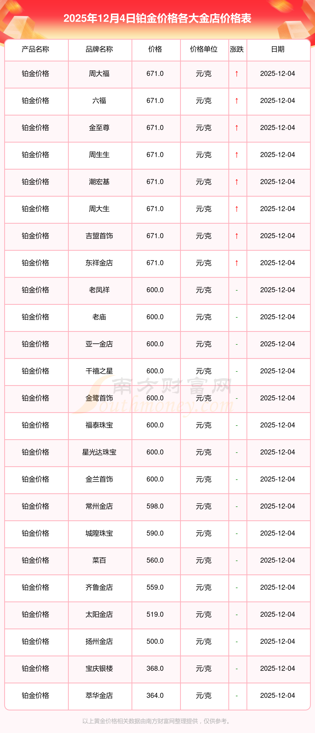 2025年12月4日,周大福、周大福、周大福、周大福、周大福、周大福、周大福、老鳳祥、老鳳祥、老鳳祥、六福等各大金店品牌鉑金價格今日價格如下:周大福1328.0元/克、周大福671.0元/克、周大福1328.0元/克、周大福46730.0、周大福19260.0、周大福42160.0、周大福1165.0元/克、老鳳祥1325.0元/克、老鳳祥600.0元/克、老鳳祥1325.0元/克、六福1326.0元/克。
