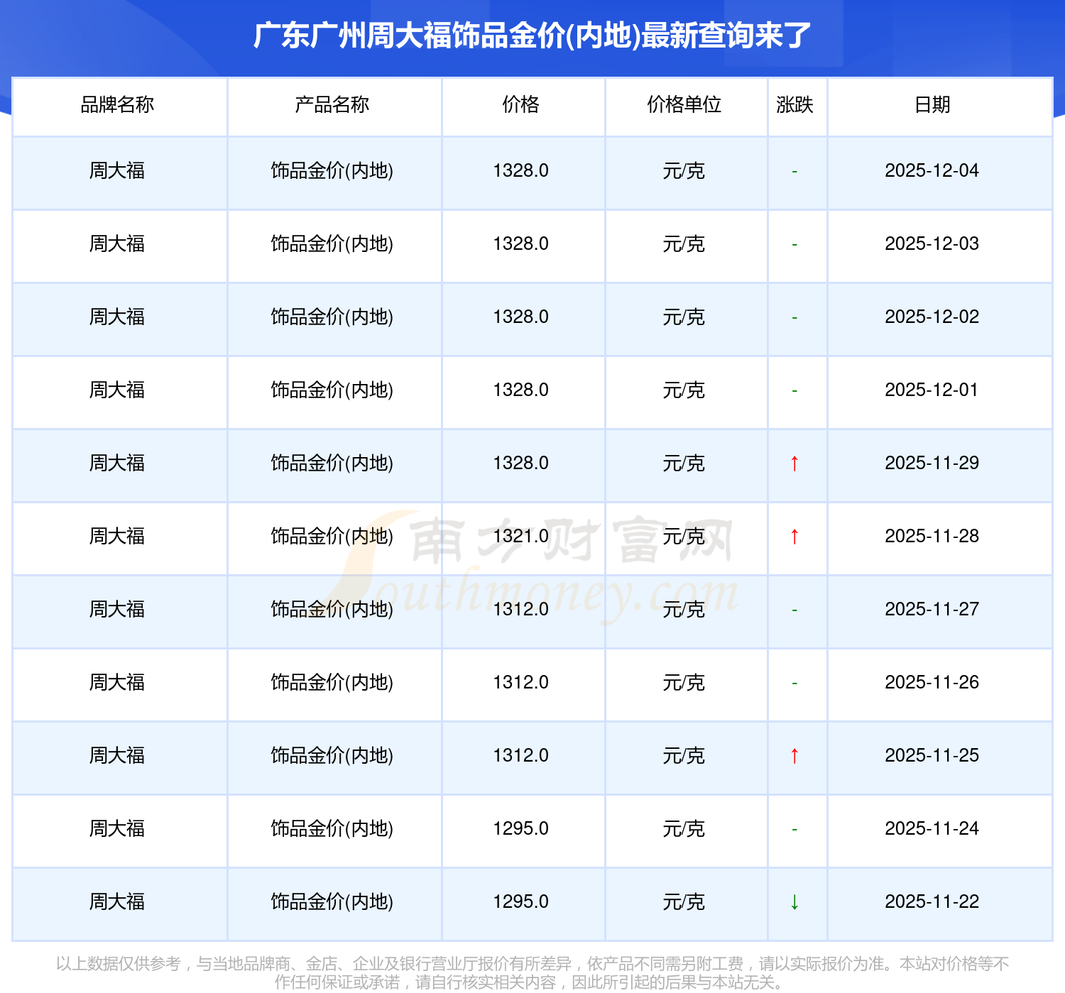 2025年12月4日各大金店飾品金價(jià)(內(nèi)地)最新價(jià)格:周大福1328.0元/克,周大福671.0元/克,周大福1328.0元/克,周大福46730.0,周大福19260.0,周大福42160.0,周大福1165.0元/克,老鳳祥1325.0元/克,老鳳祥600.0元/克,老鳳祥1325.0元/克,六福1326.0元/克。