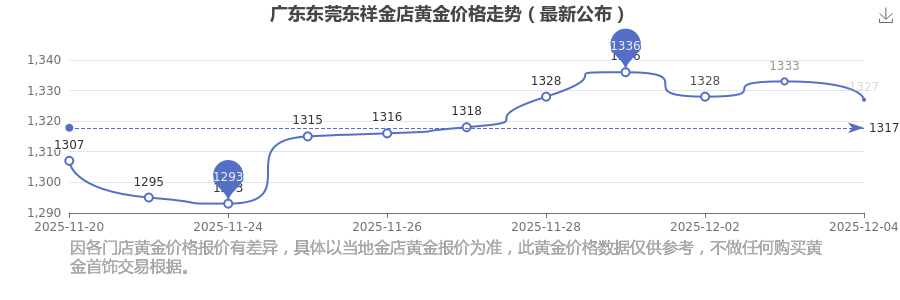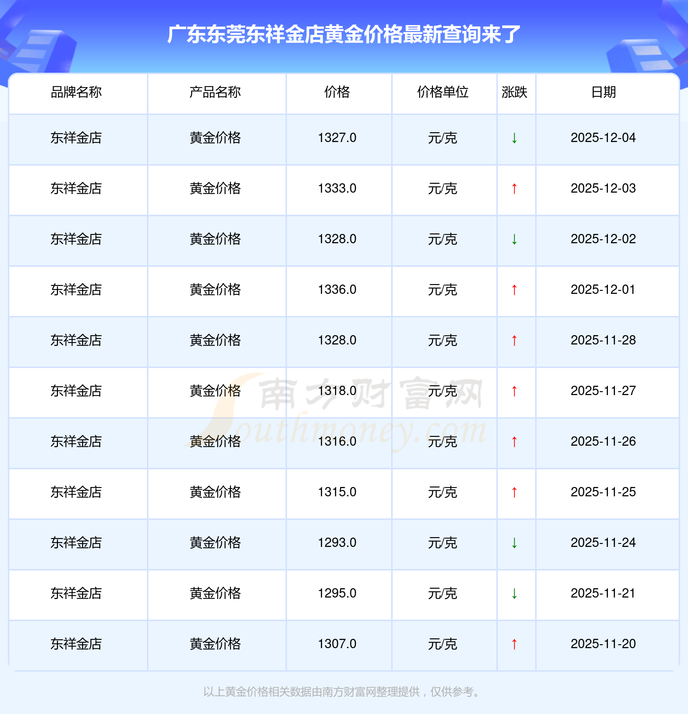 (2025年12月4日)今日廣東東莞東祥金店黃金價格是1327.0元/克。