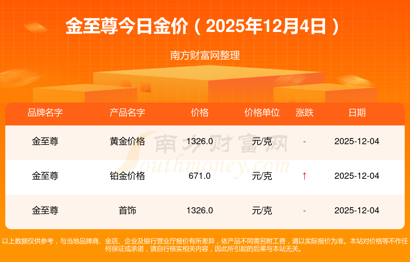 今天是2025年12月4日,周大福、周大福、周大福、周大福、周大福、周大福、周大福、老鳳祥、老鳳祥、老鳳祥、六福等各大金店品牌黃金價(jià)格最新價(jià)格如下:周大福1328.0元/克、周大福671.0元/克、周大福1328.0元/克、周大福46730.0、周大福19260.0、周大福42160.0、周大福1165.0元/克、老鳳祥1325.0元/克、老鳳祥600.0元/克、老鳳祥1325.0元/克、六福1326.0元/克。