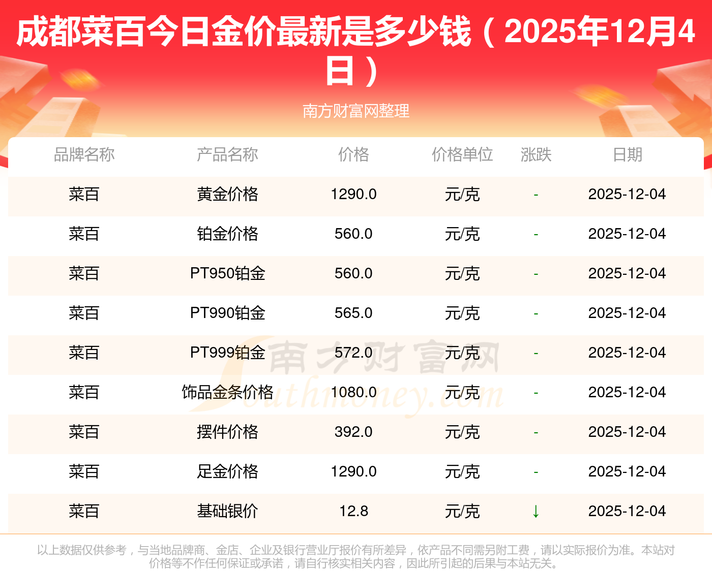 2025年12月4日成都菜百今日價格:黃金價格1328.0元/克,鉑金價格671.0元/克,飾品金價(內(nèi)地)1328.0元/克,黃金飾品(香港)46730.0,鉑金價格(香港)19260.0,金條價格(香港)42160.0,金條金價(內(nèi)地)1165.0元/克,黃金價格1325.0元/克,鉑金價格600.0元/克,足金價格1325.0元/克,黃金價格1326.0元/克。
