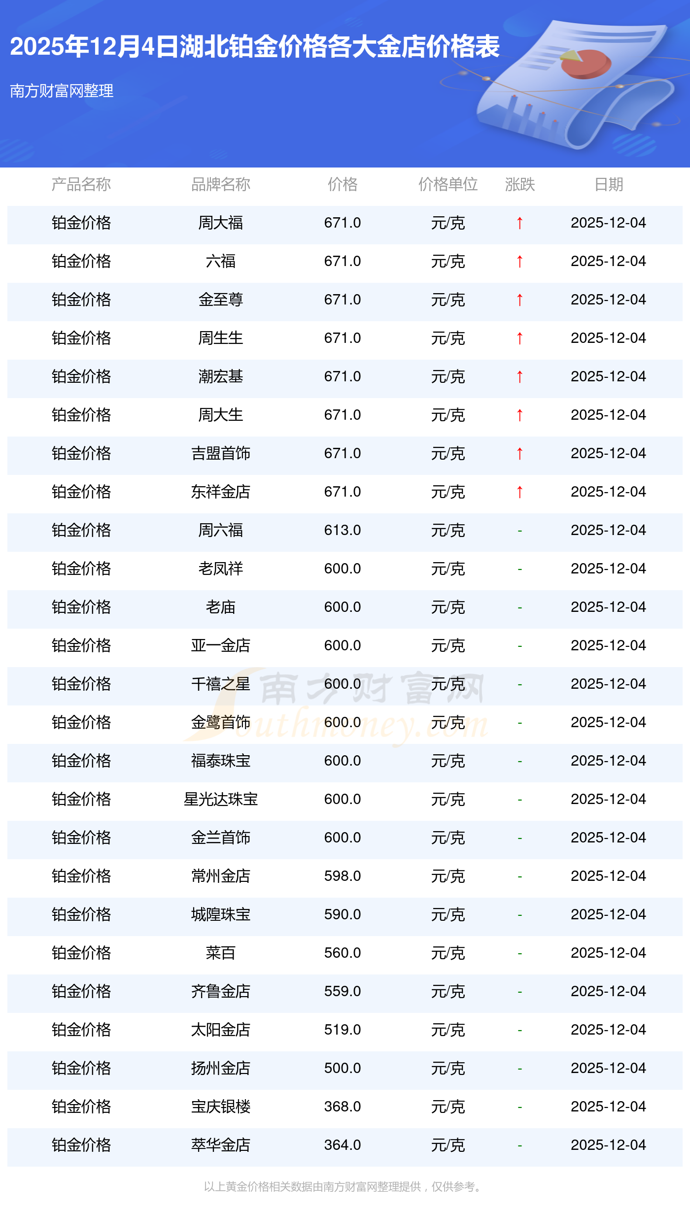 2025年12月4日湖北周大福、周大福、周大福、周大福、周大福、周大福、周大福、老鳳祥、老鳳祥、老鳳祥、六福等各大金店品牌鉑金價(jià)格最新價(jià)格行情來(lái)了,如下:周大福黃金價(jià)格1328.0元/克,周大福鉑金價(jià)格671.0元/克,周大福飾品金價(jià)(內(nèi)地)1328.0元/克,周大福黃金飾品(香港)46730.0,周大福鉑金價(jià)格(香港)19260.0,周大福金條價(jià)格(香港)42160.0,周大福金條金價(jià)(內(nèi)地)1165.0元/克,老鳳祥黃金價(jià)格1325.0元/克,老鳳祥鉑金價(jià)格600.0元/克,老鳳祥足金價(jià)格1325.0元/克,六福黃金價(jià)格1326.0元/克。