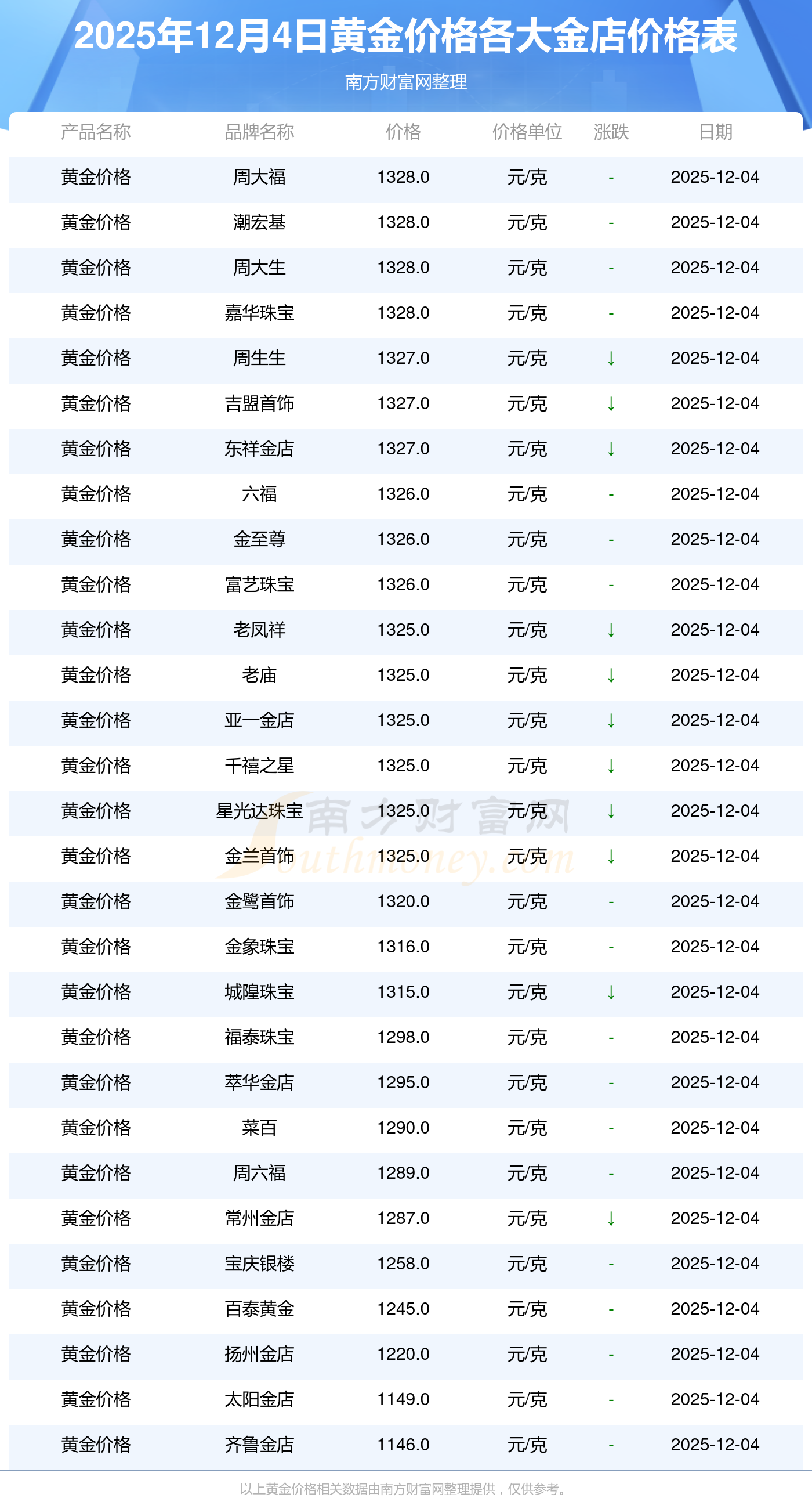 今天是2025年12月4日,周大福、周大福、周大福、周大福、周大福、周大福、周大福、老鳳祥、老鳳祥、老鳳祥、六福等各大金店品牌黃金價(jià)格最新價(jià)格如下:周大福1328.0元/克、周大福671.0元/克、周大福1328.0元/克、周大福46730.0、周大福19260.0、周大福42160.0、周大福1165.0元/克、老鳳祥1325.0元/克、老鳳祥600.0元/克、老鳳祥1325.0元/克、六福1326.0元/克。