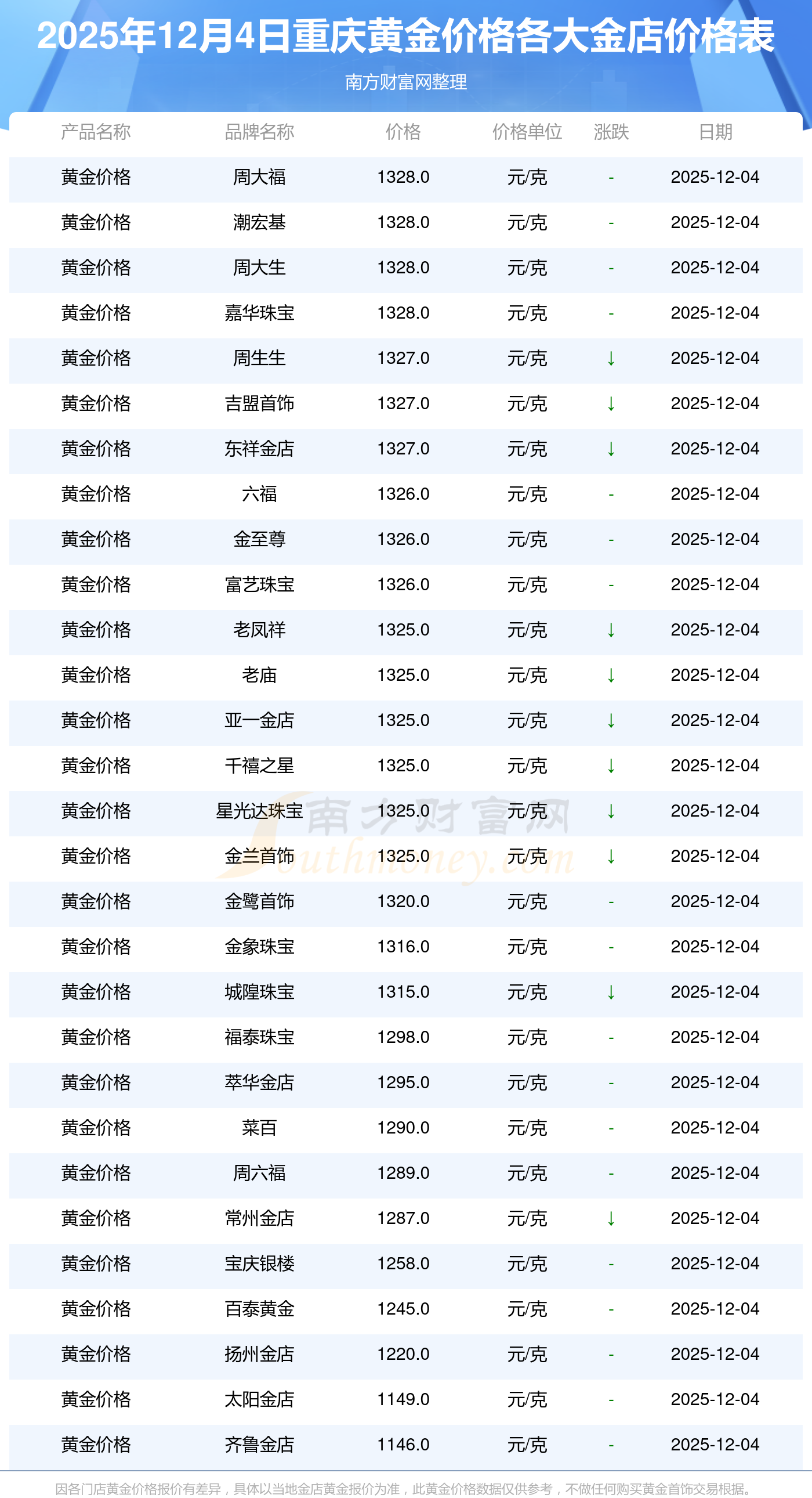 2025年12月4日,重慶周大福、周大福、周大福、周大福、周大福、周大福、周大福、老鳳祥、老鳳祥、老鳳祥、六福等各大金店品牌黃金價格今日價格如下:周大福1328.0元/克、周大福671.0元/克、周大福1328.0元/克、周大福46730.0、周大福19260.0、周大福42160.0、周大福1165.0元/克、老鳳祥1325.0元/克、老鳳祥600.0元/克、老鳳祥1325.0元/克、六福1326.0元/克。