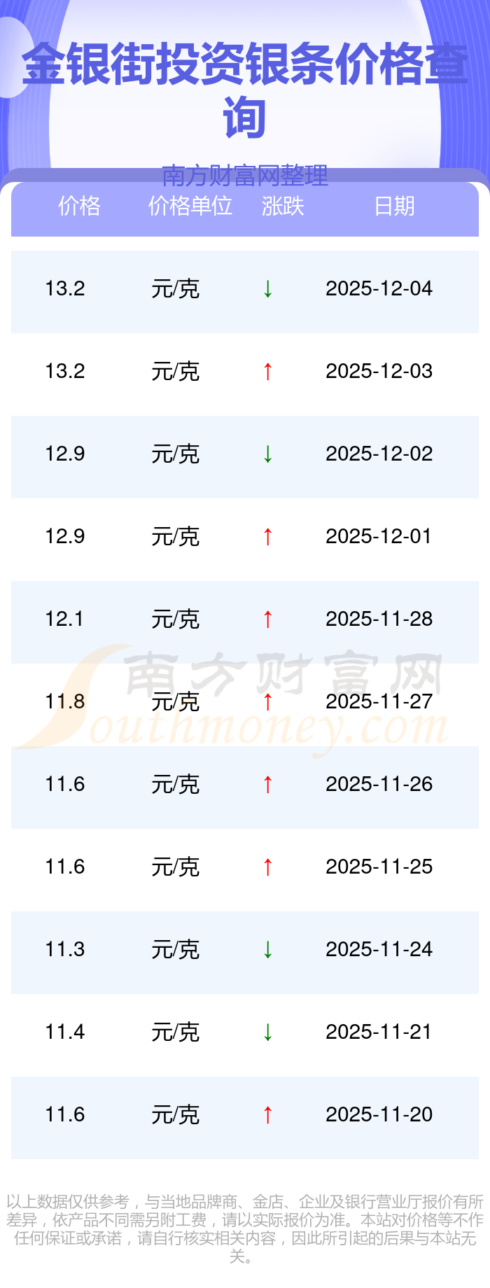 最新數(shù)據(jù)表明,金銀街今日 投資銀條價(jià)格為13.2元/克。