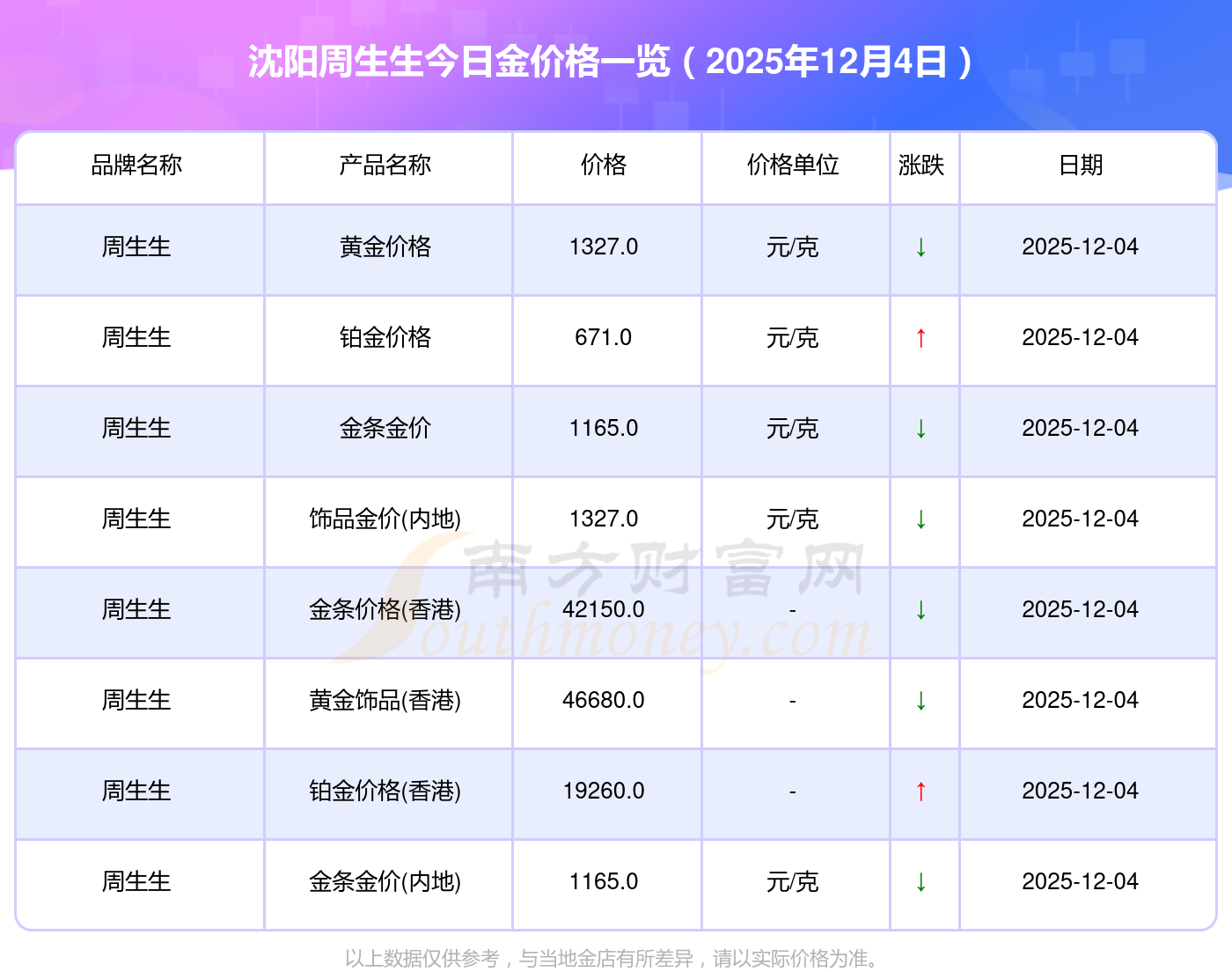2025年12月4日沈陽(yáng)周生生最新價(jià)格:黃金價(jià)格1328.0元/克,鉑金價(jià)格671.0元/克,飾品金價(jià)(內(nèi)地)1328.0元/克,黃金飾品(香港)46730.0,鉑金價(jià)格(香港)19260.0,金條價(jià)格(香港)42160.0,金條金價(jià)(內(nèi)地)1165.0元/克,黃金價(jià)格1325.0元/克,鉑金價(jià)格600.0元/克,足金價(jià)格1325.0元/克,黃金價(jià)格1326.0元/克。