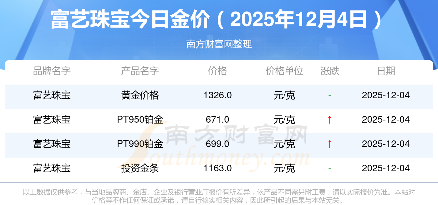 富藝珠寶今日金價的具體數(shù)字是怎樣的?數(shù)據(jù)來了:黃金價格1328.0元/克,鉑金價格671.0元/克,飾品金價(內(nèi)地)1328.0元/克,黃金飾品(香港)46730.0,鉑金價格(香港)19260.0,金條價格(香港)42160.0,金條金價(內(nèi)地)1165.0元/克,黃金價格1325.0元/克,鉑金價格600.0元/克,足金價格1325.0元/克,黃金價格1326.0元/克。