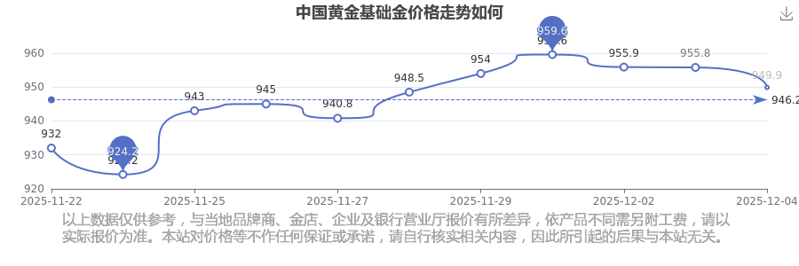 今日中國黃金 基礎(chǔ)金價格,最新確定為949.9元/克。