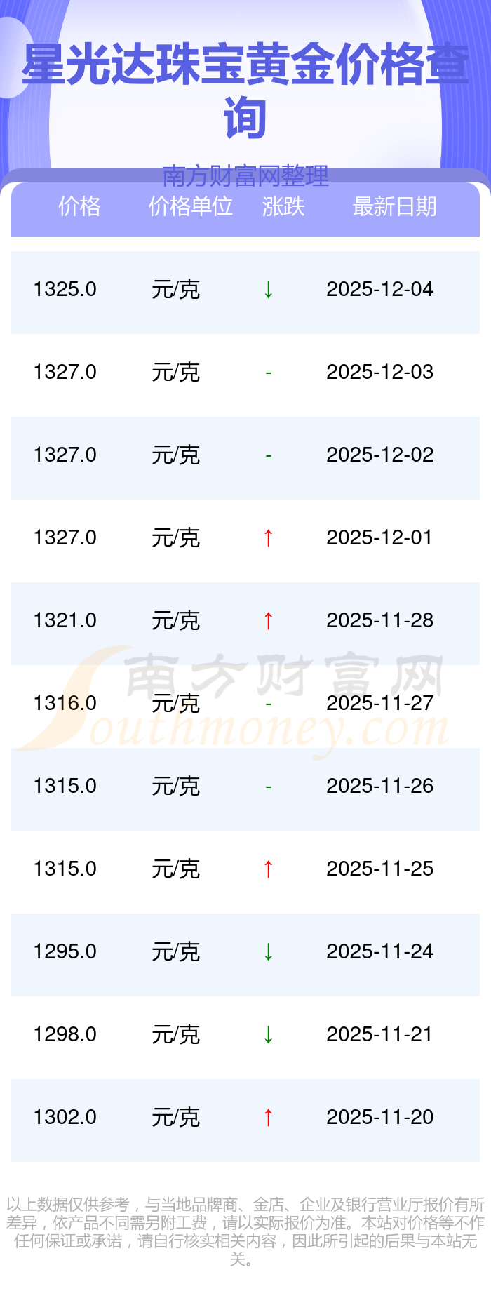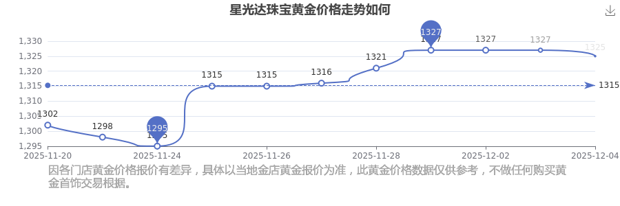 今日黃金價格查詢_現(xiàn)在金價黃金一克多少錢,黃金價格是多少錢一克?一般情況下黃金每克的價位是多少左右?最新數(shù)據(jù)表明,星光達(dá)珠寶今日 黃金價格為1325.0元/克。