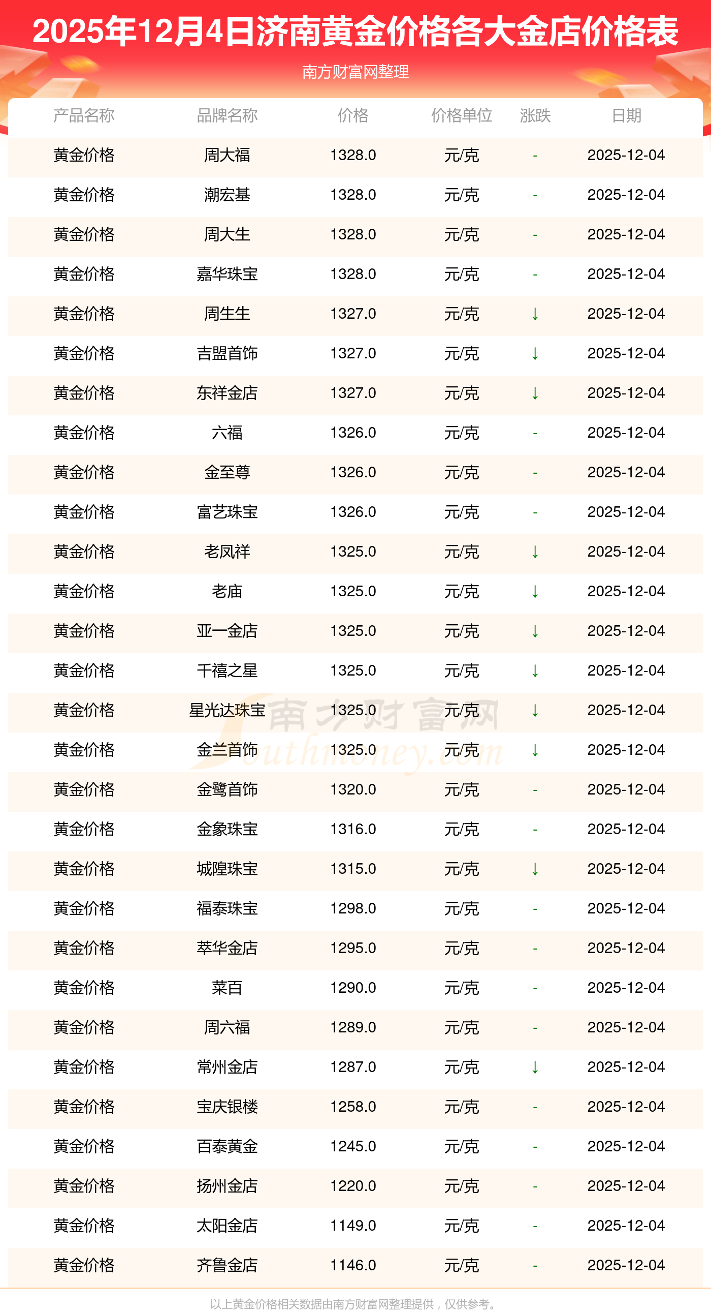 2025年12月4日濟(jì)南各大金店黃金價(jià)格最新價(jià)格查詢來(lái)了:周大福1328.0元/克,周大福671.0元/克,周大福1328.0元/克,周大福46730.0,周大福19260.0,周大福42160.0,周大福1165.0元/克,老鳳祥1325.0元/克,老鳳祥600.0元/克,老鳳祥1325.0元/克,六福1326.0元/克。