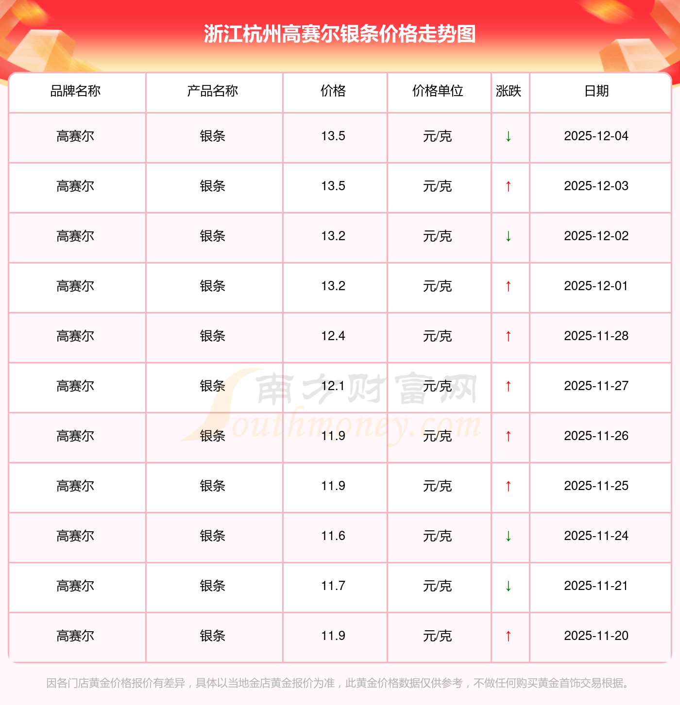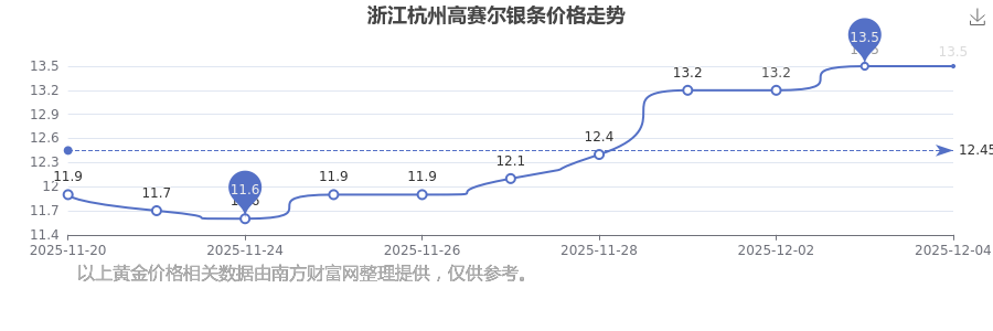 浙江杭州高賽爾 2025年12月4日的銀條價(jià)位為 13.5元/克。